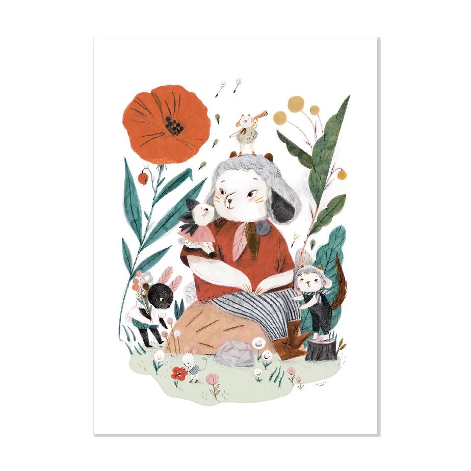 Affiche 50X70cm de la collection Après la pluie. Fenouil le mouton et ses amis explorent au jardin. Illustrée par Lucille Michieli. Imprimé en France à base d’encres végétales sur du papier certifié FSC. Vendue sous tube.