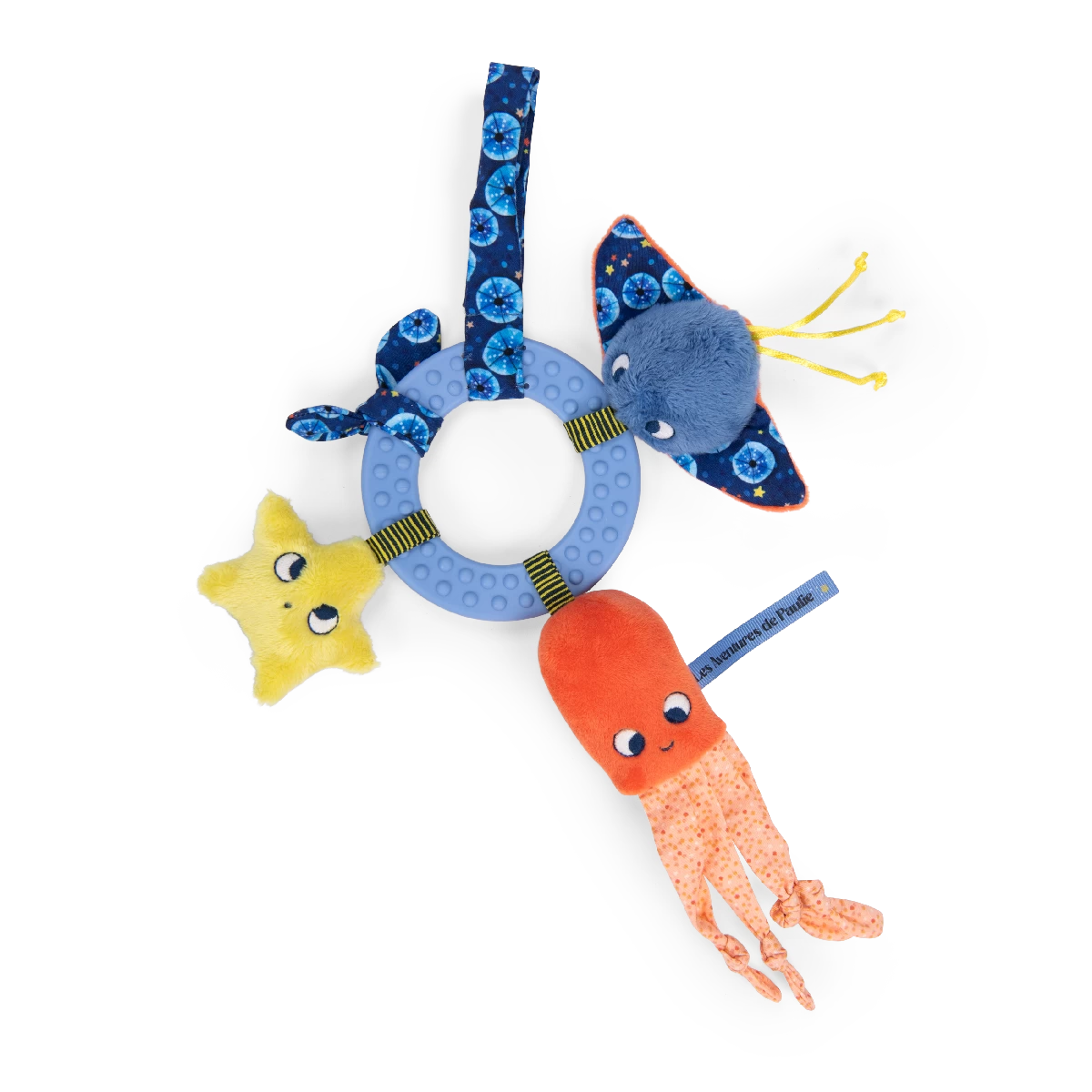 Anneau d’activités à manipuler ou à suspendre. Il est composé de trois petits personnages marins aux matières et sons différents, d’une nouette décorative et d’un grand anneau de dentition texturé que bébé pourra mâchouiller..