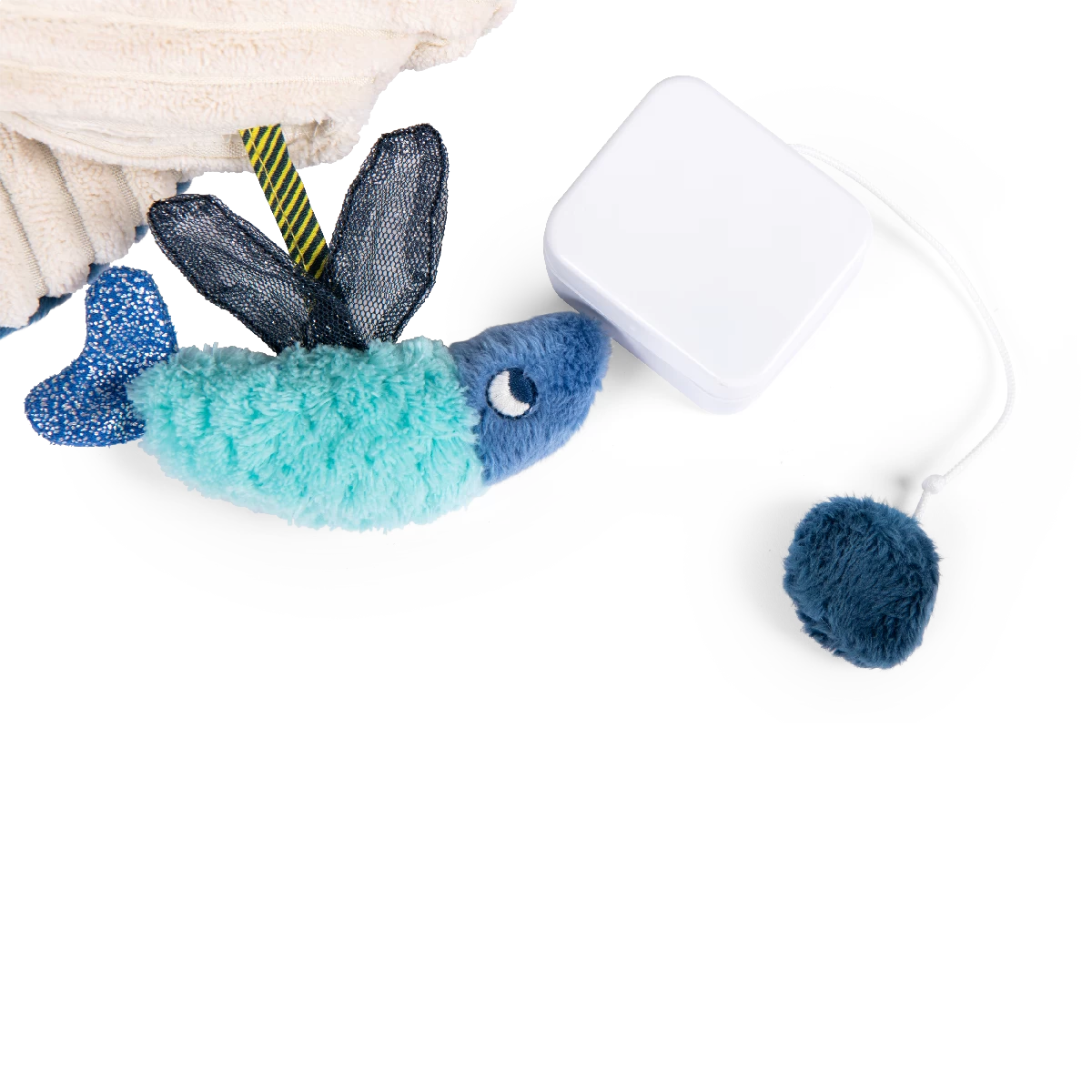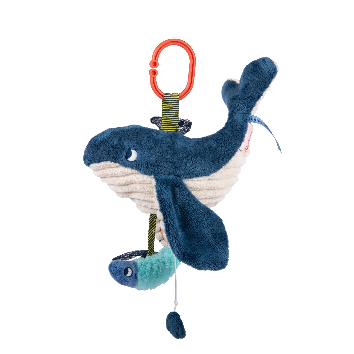 Cette baleine musicale est dotée d’une accroche universelle. Au son de sa douce mélodie, bébé s’endormira paisiblement et à son réveil il pourra jouer avec le miroir sous la nageoire et redécouvrir les diverses textures de ce tendre cétacé.