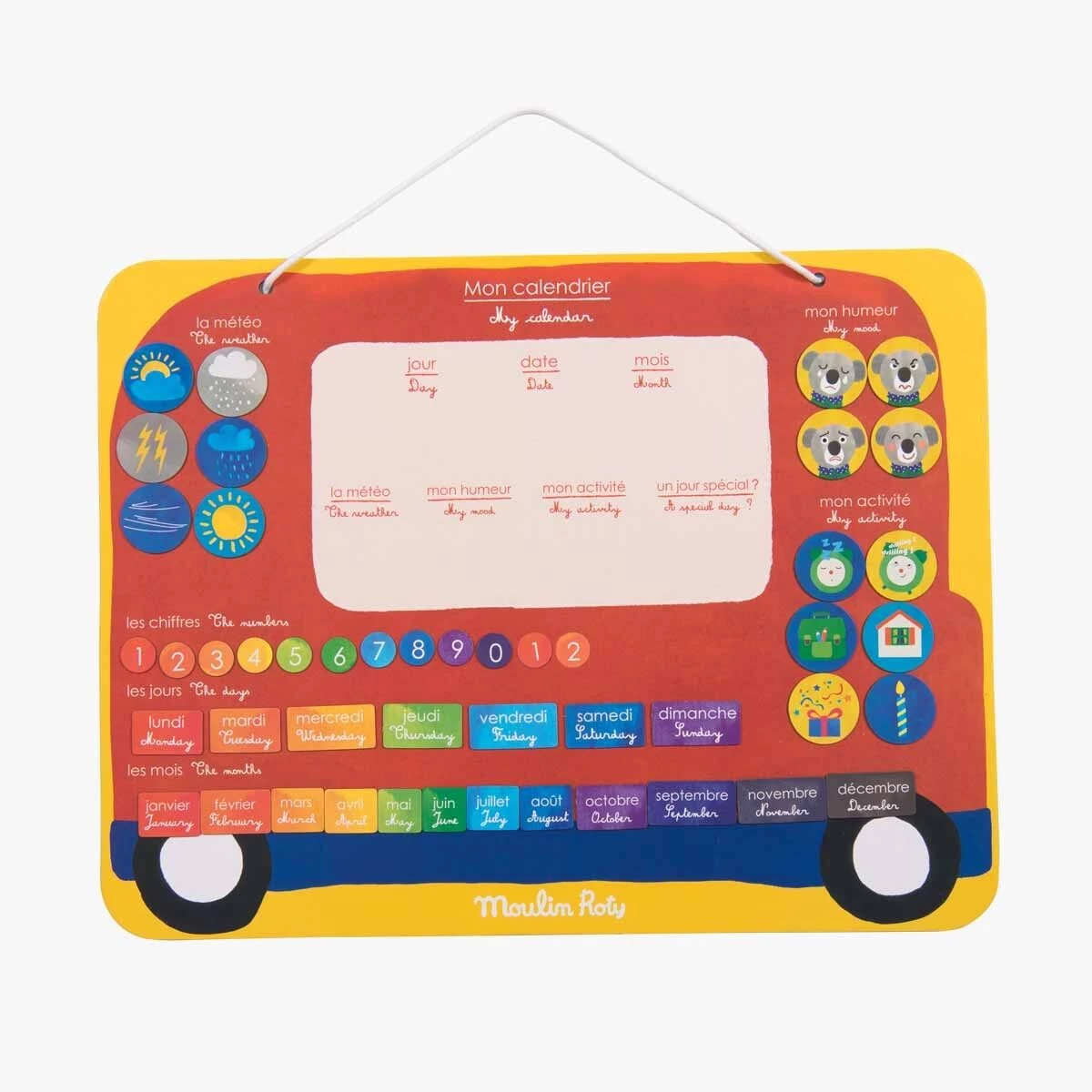 Calendrier magnétique comportant 45 magnets : les mois, les jours de la semaine et les chiffres de 0 à 9 pour ajouter la date du jour, des magnets météo, des magnets humeurs, des magnets activités et jours spéciaux. Peut s’accrocher au mur.