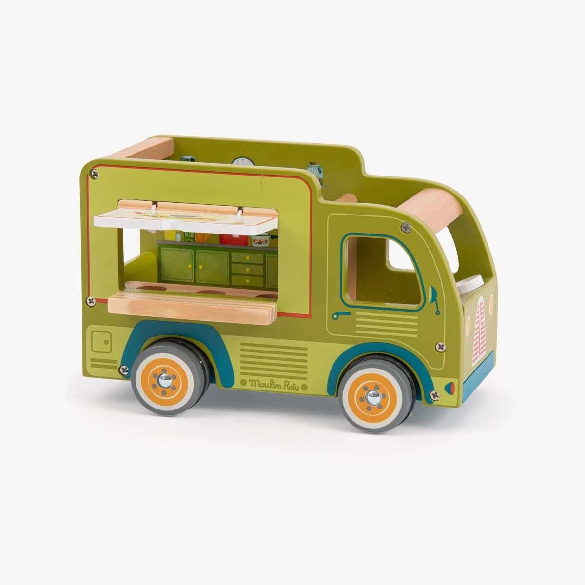 Ding-dong ! Le camion-restaurant de la Grande Famille est prêt à vous servir ses bons petits plats : soupes et tartines comme à la maison ! Tout en bois et entièrement illustré, il roule et comprend une fenêtre ouvrante pour accueillir les clients. Personnages vendus séparément.