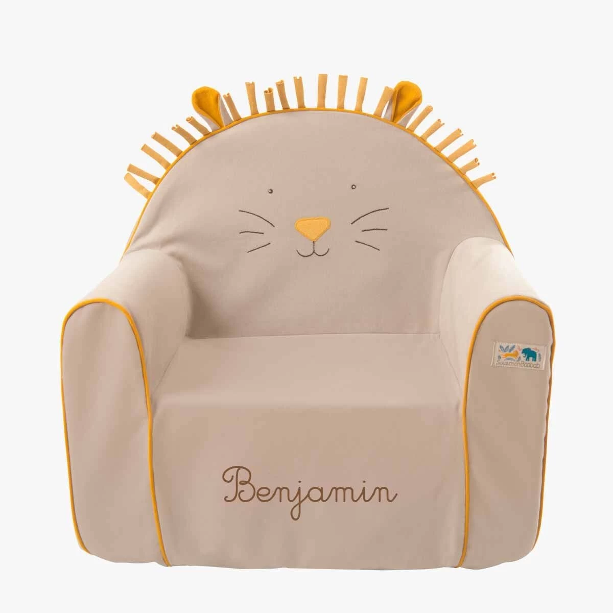 Un lion souriant, avec une belle crinière au milieu de laquelle s’assoir… ! Cette chauffeuse en mousse, habillée d’une housse amovible et lavable, peut être brodée au prénom de l’enfant.