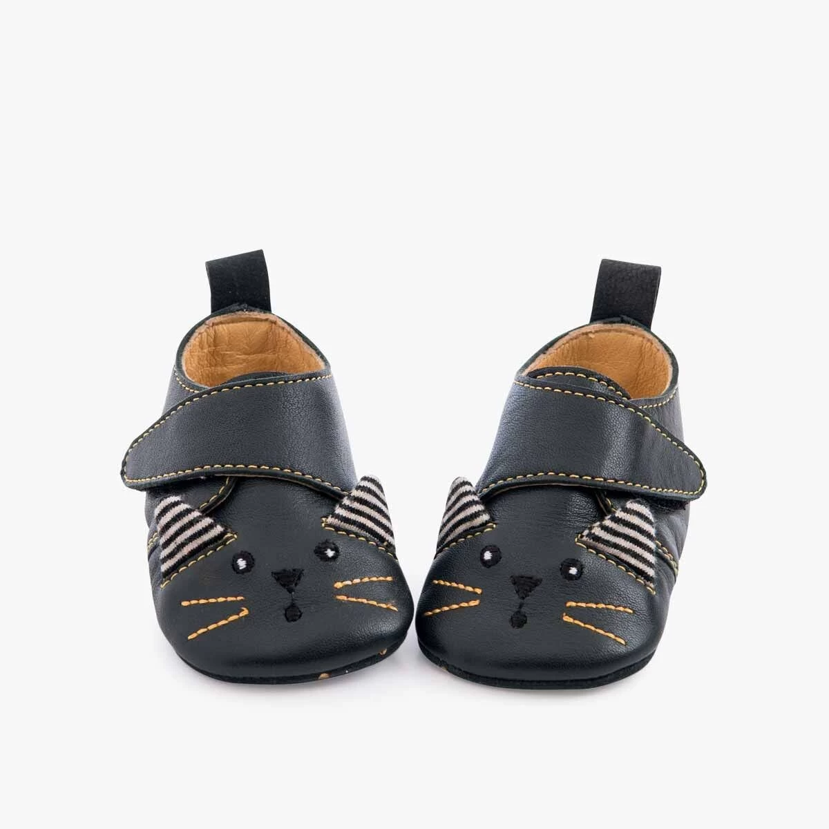 Chaussons en cuir avec fermeture à scratch, brodés d’une tête de chat avec ses oreilles rayées. Ils sont doublés, souples, avec une semelle en cuir velours antidérapante et une semelle intérieure amovible avec mousse, pour le confort de bébé !