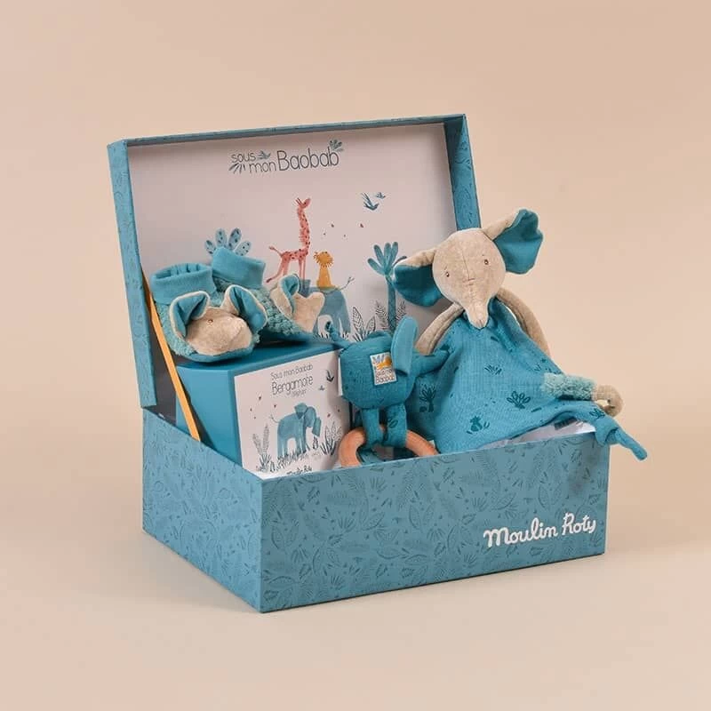 A la recherche d’un coffret prêt à offrir pour un nouveau-né ? Cette box Moulin Roty est le cadeau naissance personnalisé idéal pour combler les jeunes parents. Ce coffret cadeau contient 3 essentiels pour gâter bébé : un doudou attache-tétine à personnaliser Bergamote l’éléphant avec les chaussons éléphant et le hochet bois assortis. Le tout est livré dans une magnifique boîte illustrée aux couleurs de la collection Sous mon baobab et qui peut être conservée pour ranger les premiers souvenirs de bébé. Petit plus : la broderie sur le doudou est offerte ; réalisée par nos soins, le succès est garanti auprès des parents ! Enfin, vous pouvez accompagner cette box naissance d’un petit mot et la faire livrer directement aux nouveaux parents pour leur faire une belle surprise.