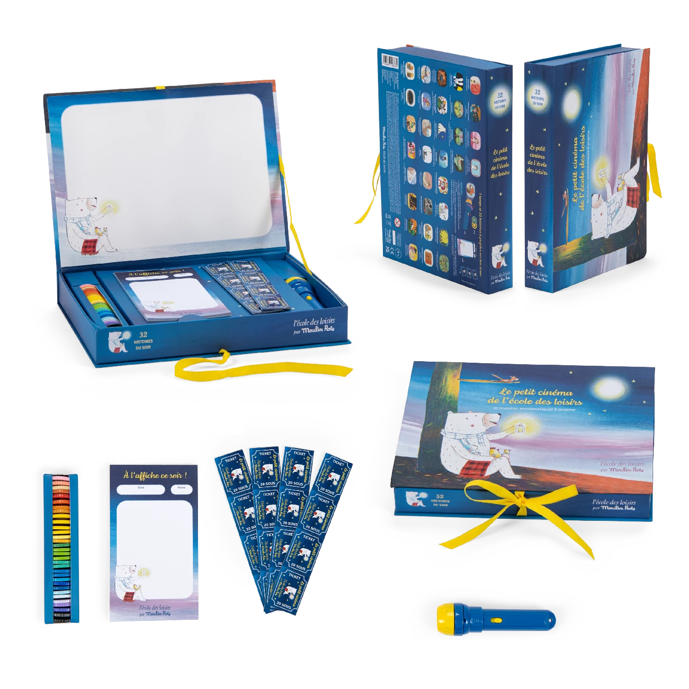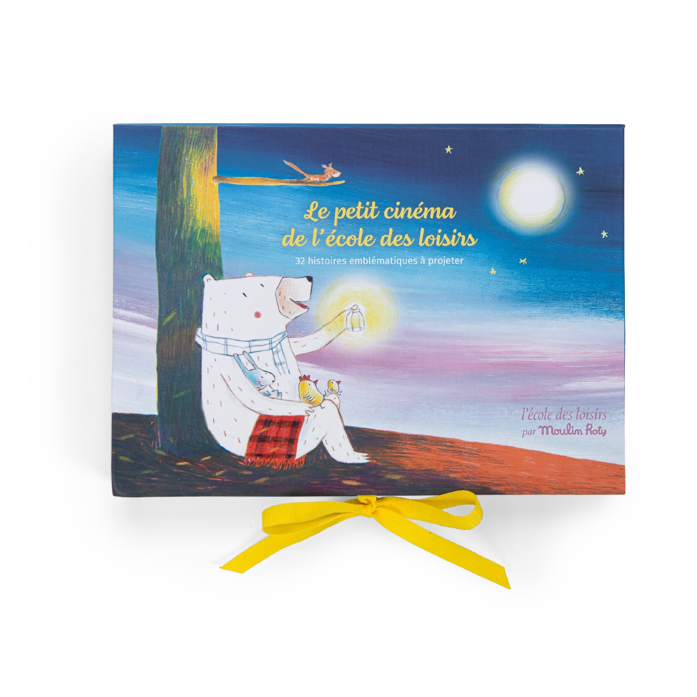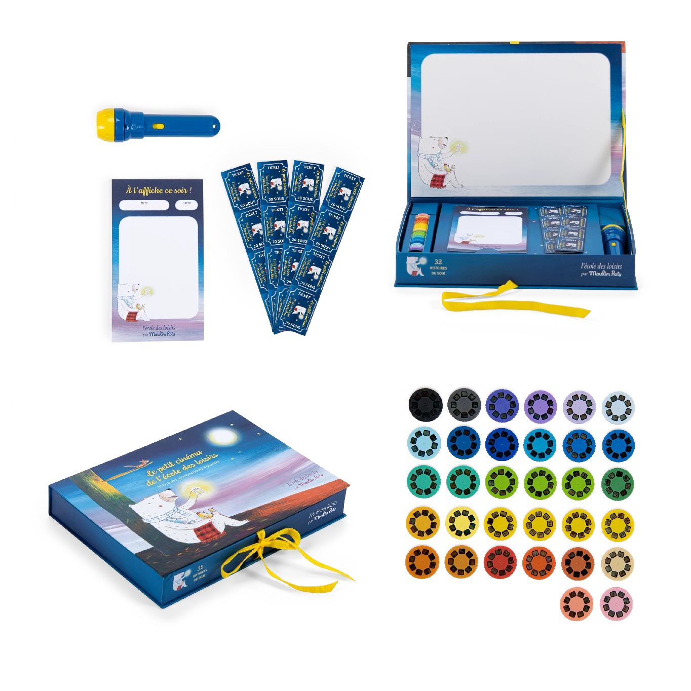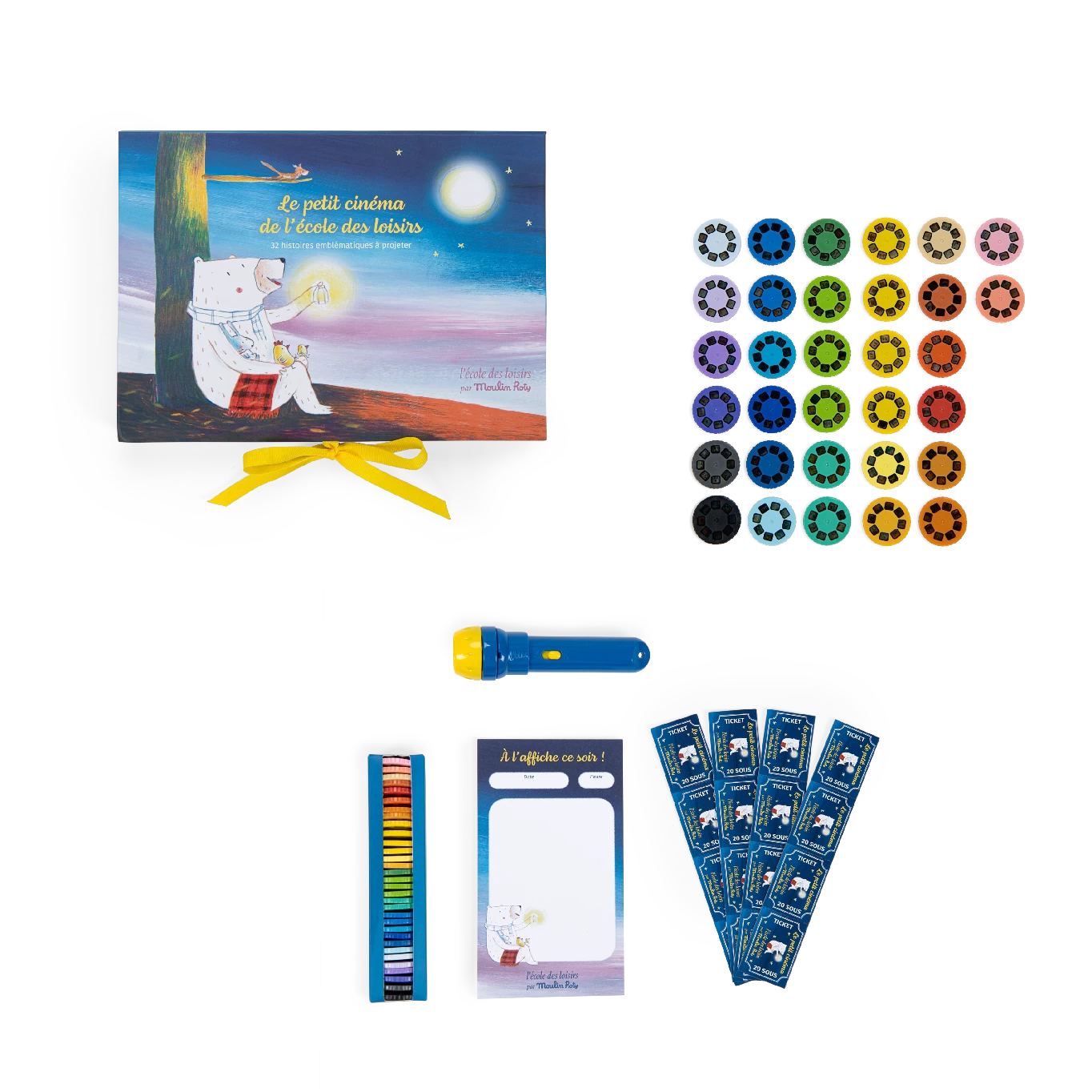 Le cinéma à la maison ! 32 histoires emblématiques de l’école des Loisirs à projeter réunies dans un coffret luxe, comprenant une lampe, 32 disques diapositives, un bloc de programmes et des tickets de cinéma pour partager la séance avec les copains….