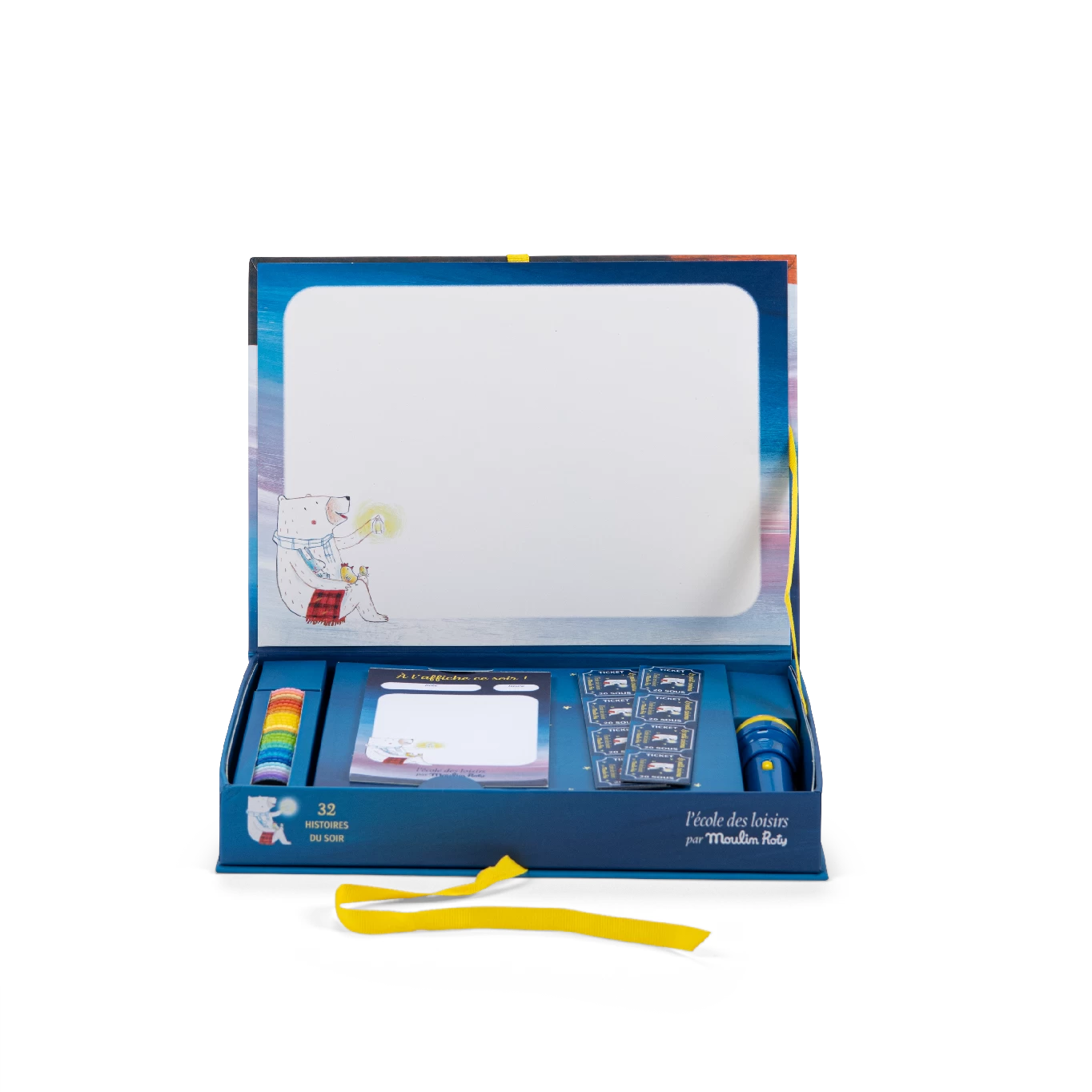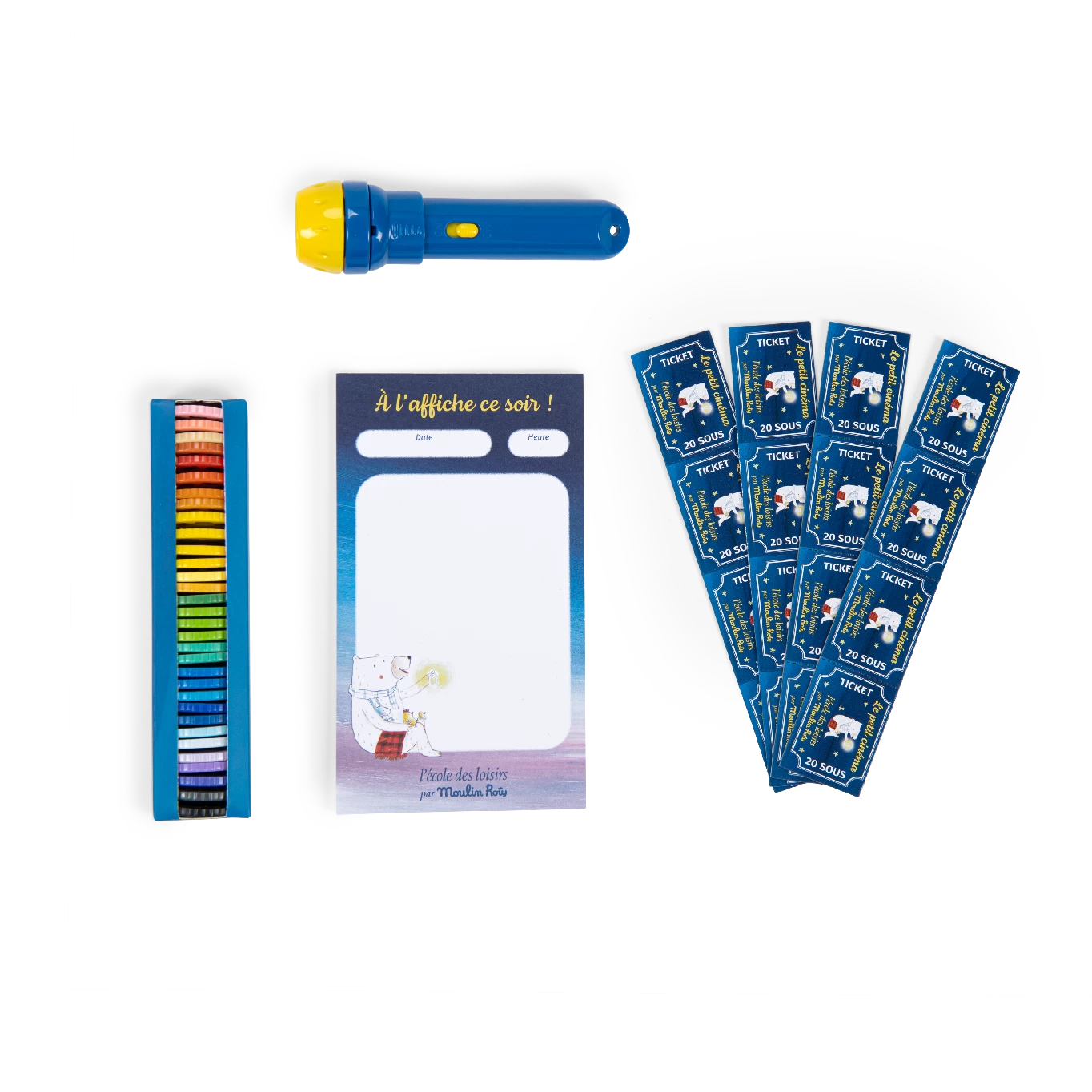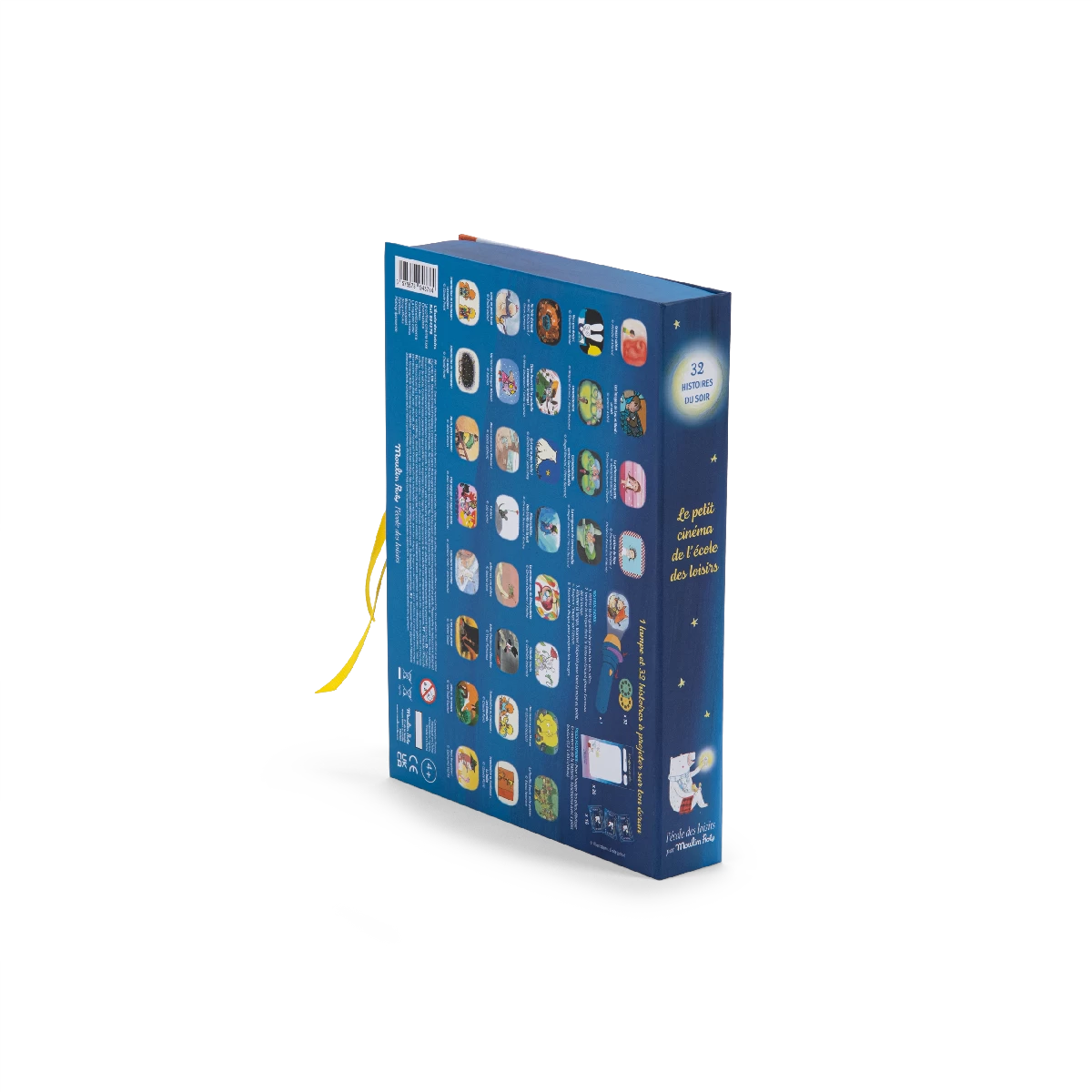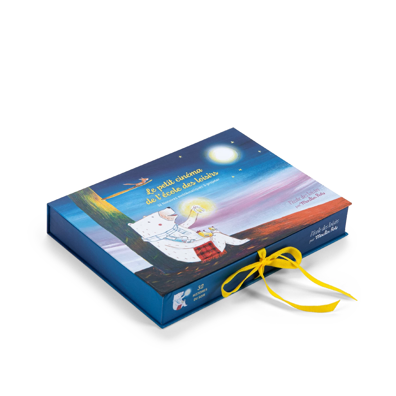 Le cinéma à la maison ! 32 histoires emblématiques de l’école des Loisirs à projeter réunies dans un coffret luxe, comprenant une lampe, 32 disques diapositives, un bloc de programmes et des tickets de cinéma pour partager la séance avec les copains….