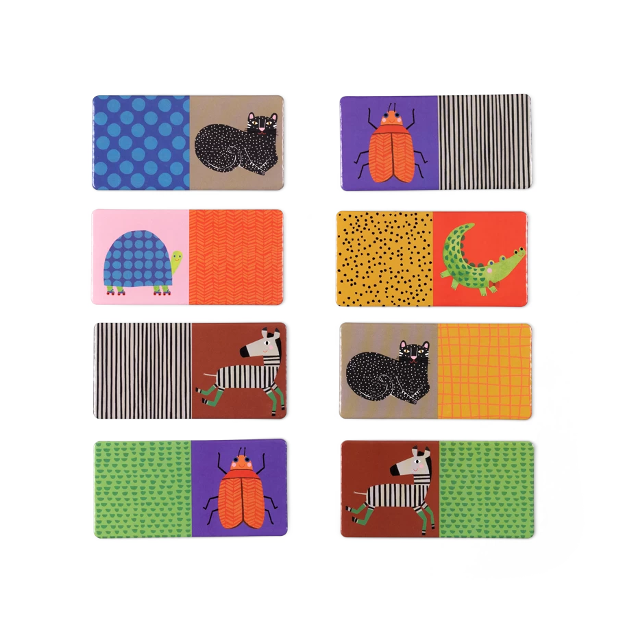 Jeu d’éveil en carton avec les animaux et les motifs des Toupitis sur une face et sur l’autre, un jeu de dominos avec de gros pois blancs sur fond rouge. Jeu pour observer, apprendre les chiffres, les couleurs et les formes. Contient 28 cartes. Dès 3 ans.