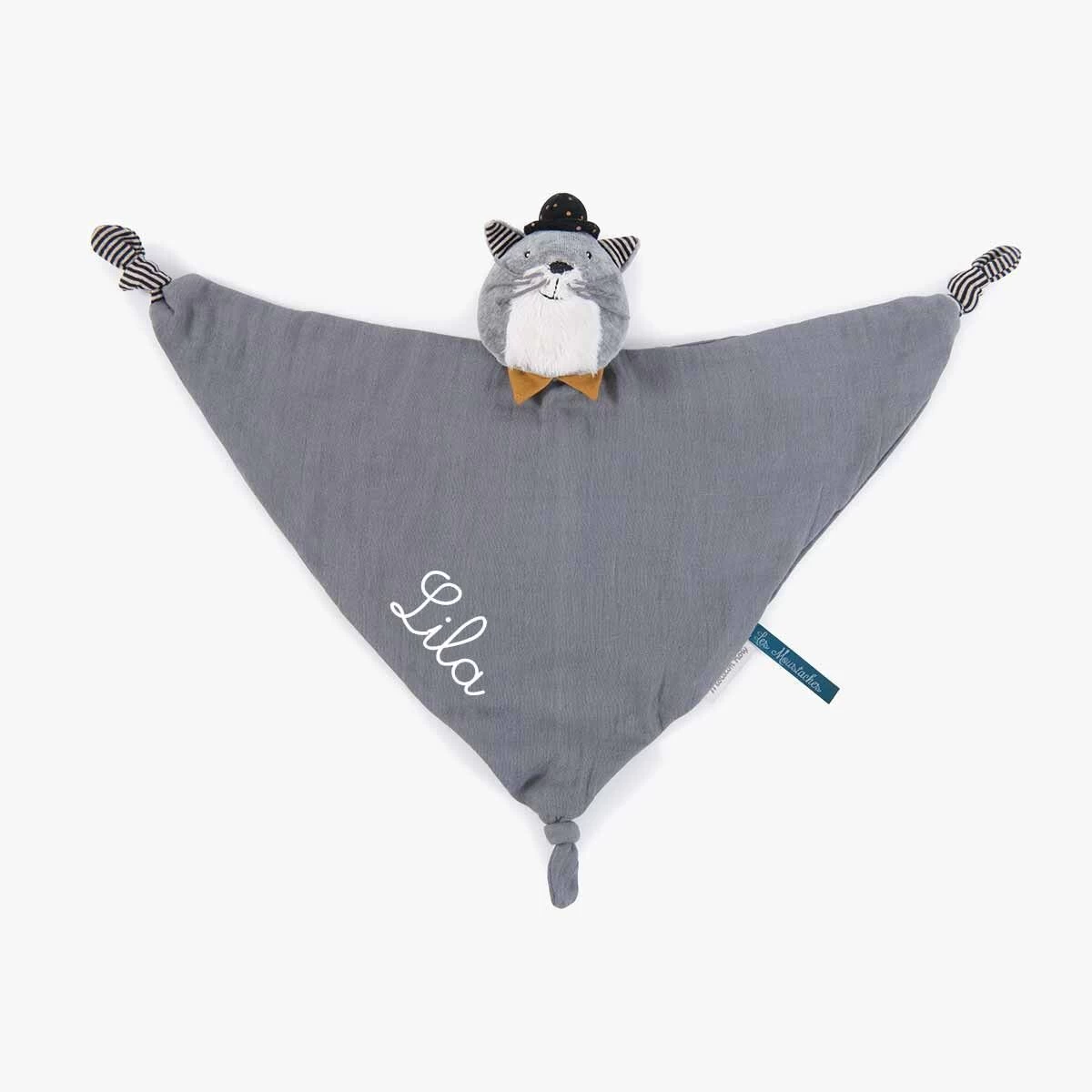 Doudou Fernand le chat en tissu lange gris clair, coiffé de son incontournable chapeau ! Noué à chaque coin, ce doudou plat est facile à saisir par les petites mains de bébé. Il peut être brodé au prénom de l’enfant. Idéal pour un cadeau naissance.