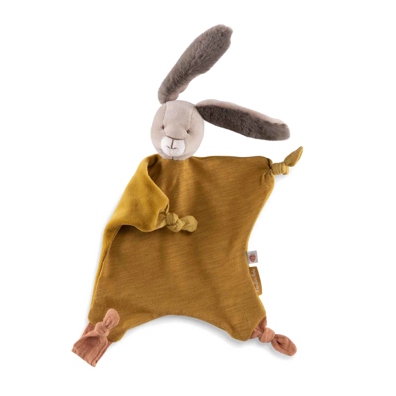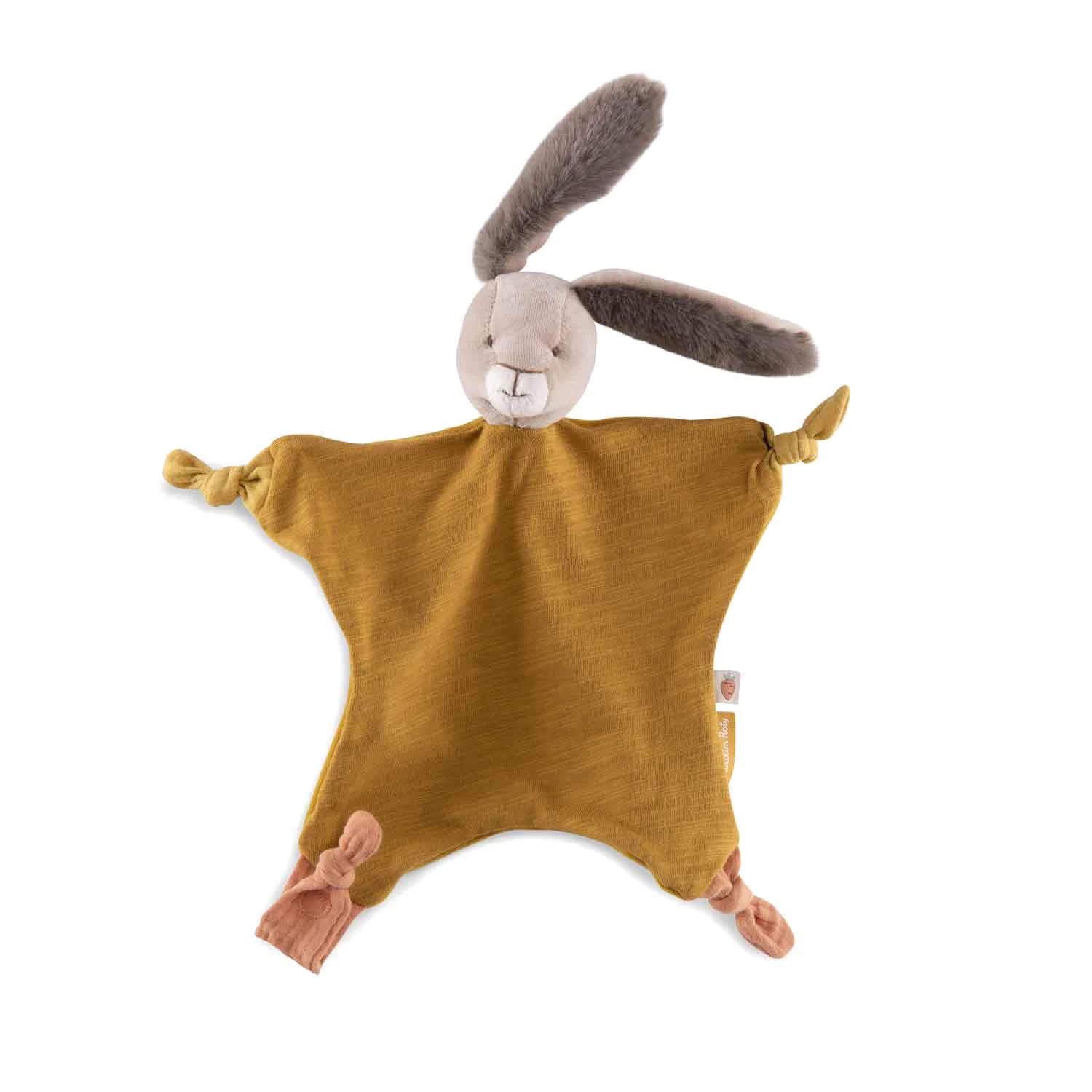 Doudou plat lapin ocre avec attache-tétine. Compagnon bi-matières réconfortant aux grandes oreilles toutes douces. Noué à chaque coin, il est facile à saisir par les petites mains et sera un allié précieux pour bébé.
