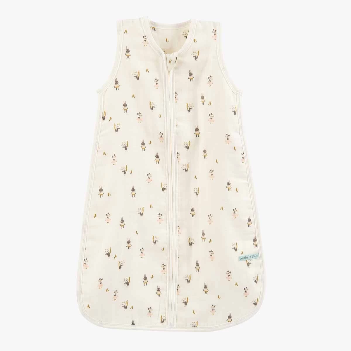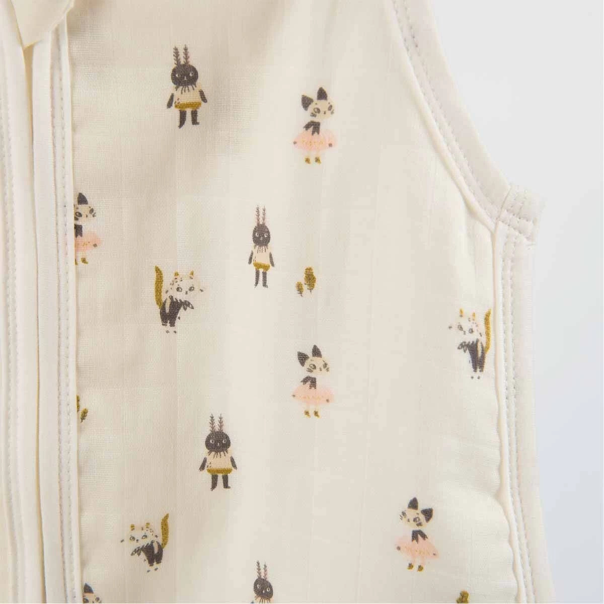 Gigoteuse été 0-6 mois (TOG 1) en coton biologique pour laisser respirer la peau de bébé, avec imprimé personnages. Zippée sur le devant.