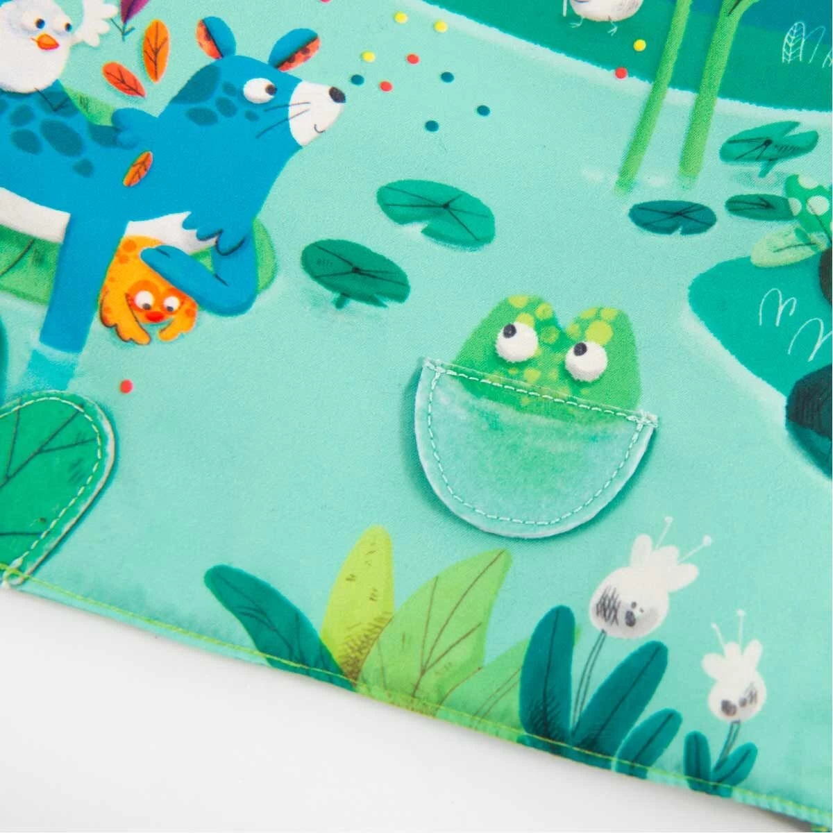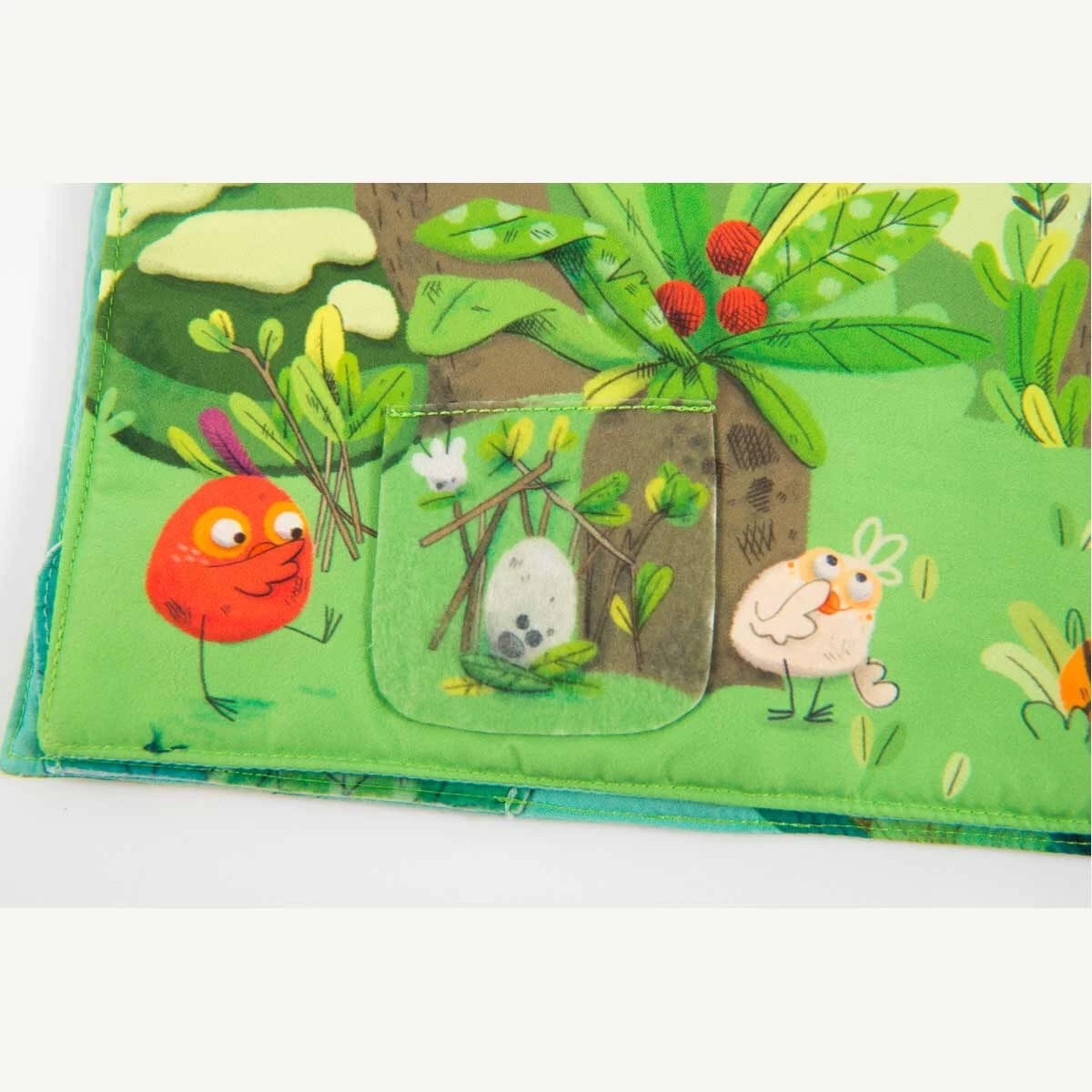 Livre en tissu 6 pages avec un petit poussin chantant à accompagner dans toutes les activités de la jungle ! Jeux de matières à découvrir et éléments à scratcher, il est idéal pour développer la motricité fine !