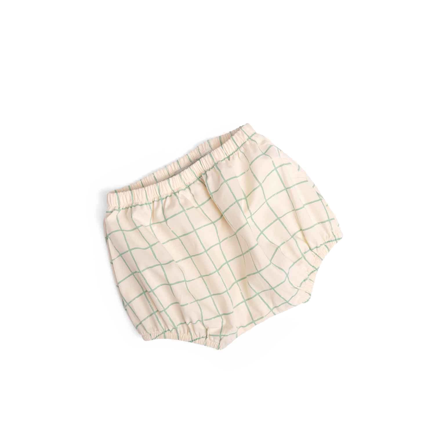 Bloomer en popeline de coton bio à carreaux vert menthe sur fond crème. Elastiqué à la ceinture et aux cuisses.