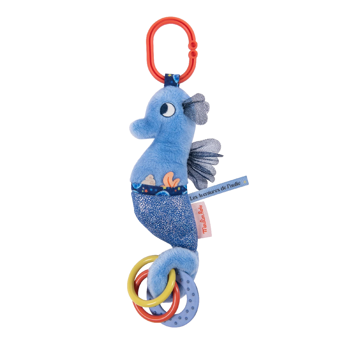 Cet hippocampe aux couleurs extraordinaires n’en finira pas d’étonner bébé : pouët, anneau à mordiller, étiquettes et tissus pailletés à attraper… Il s’accroche partout et peut être complété par d’autres petites activités nomades de la collection.