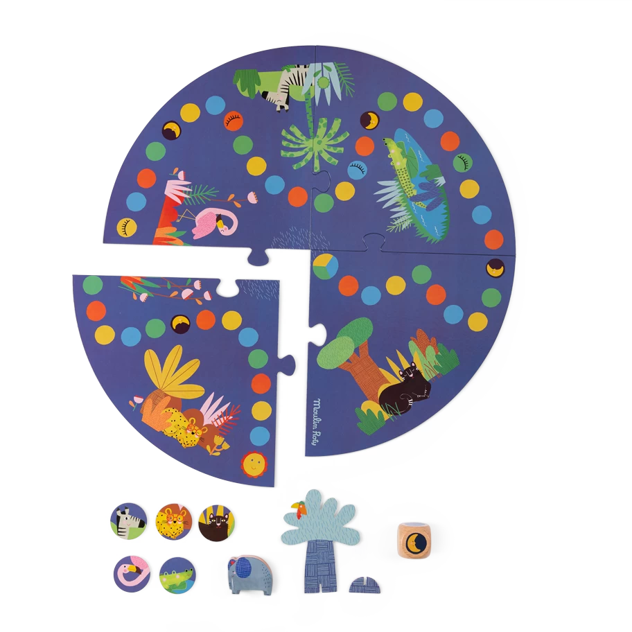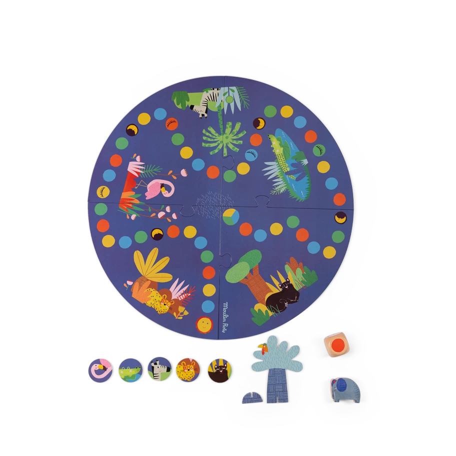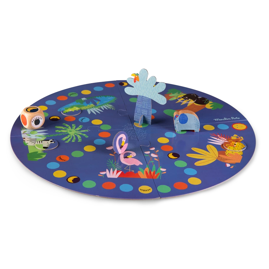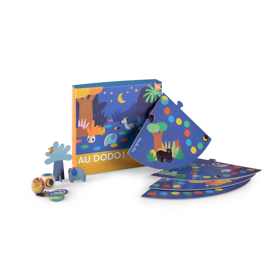 Jeu coopératif où les joueurs doivent progresser ensemble sur le parcours de couleurs pour accompagner Léon l’éléphant au pied de l’arbre bleu, sans réveiller les Toupitis. Contient 1 plateau illustré, 1 dé et 5 jetons animaux. De 2 à 4 joueurs. Dès 3 ans