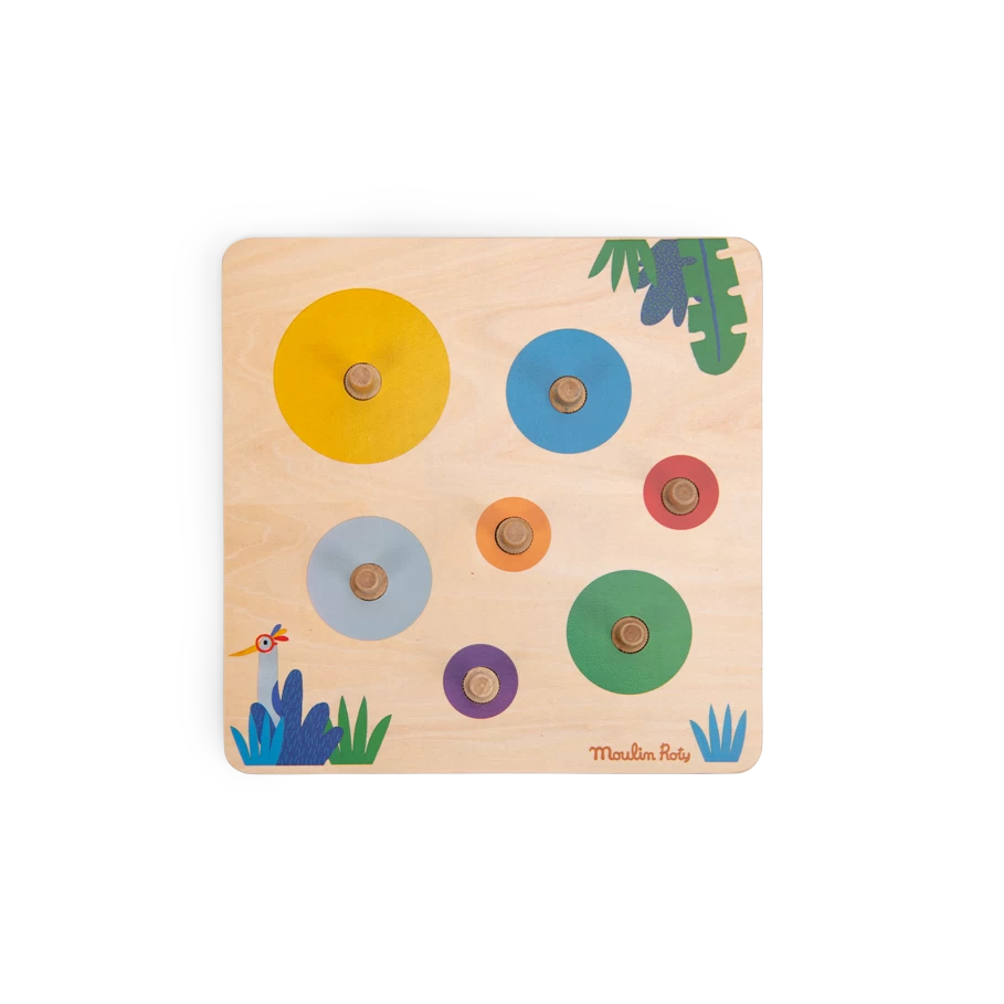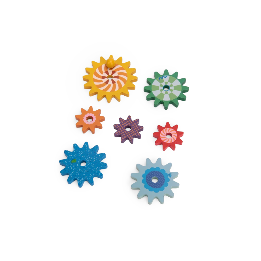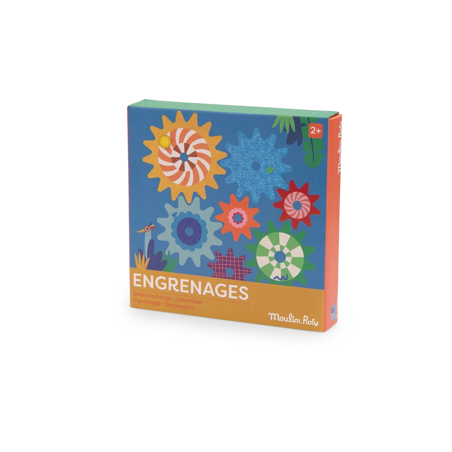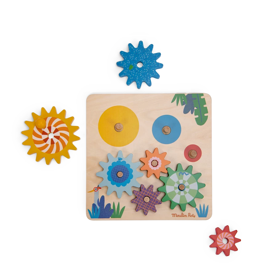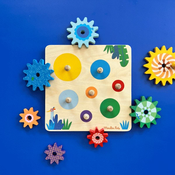 Jeu en bois pour découvrir les mécanismes à engrenages. 7 roues crantées multicolores à positionner au bon endroit sur les piliers en bois. En actionnant la roue jaune avec la poignée, l’ensemble se met à tourner dans tous les sens. Dès 2 ans.