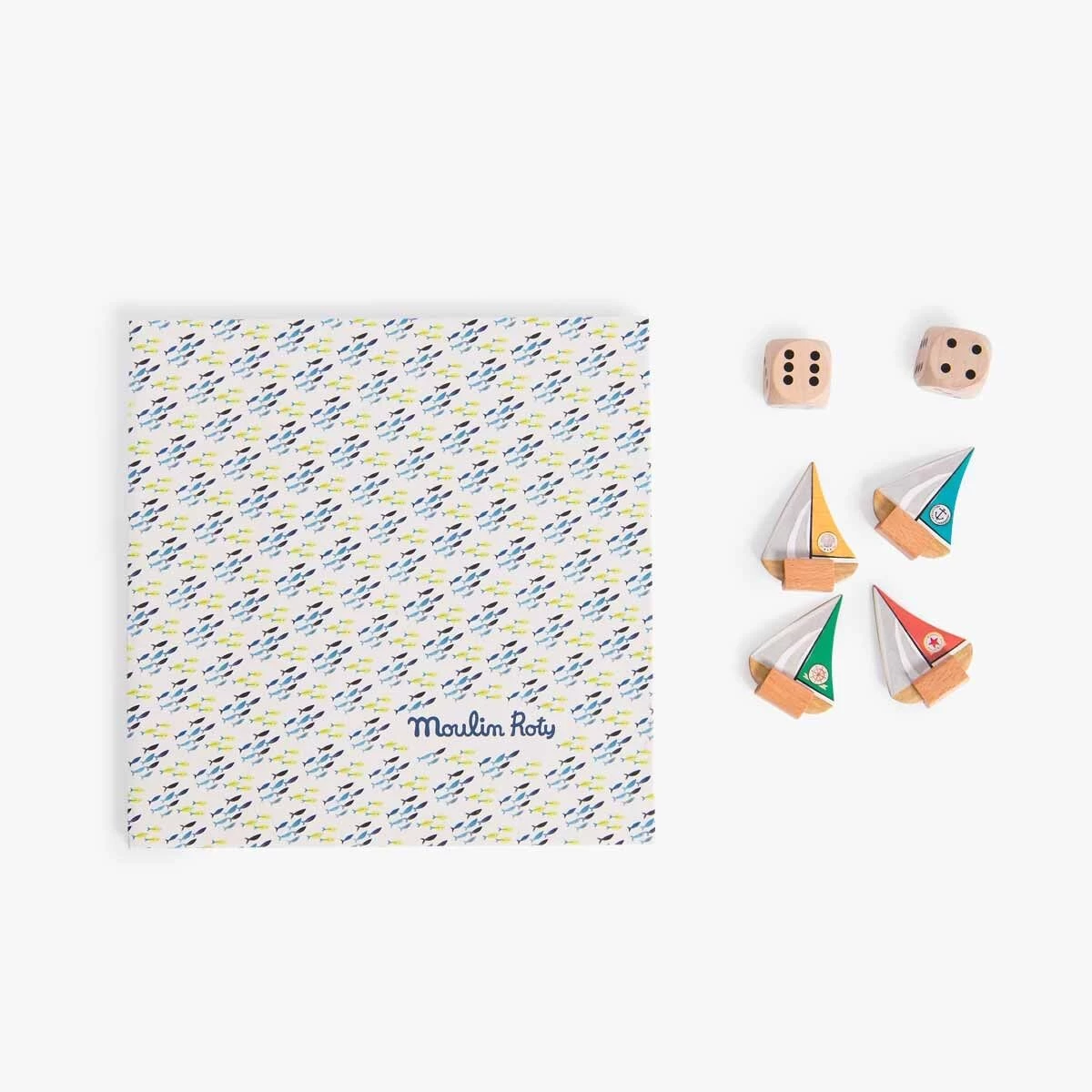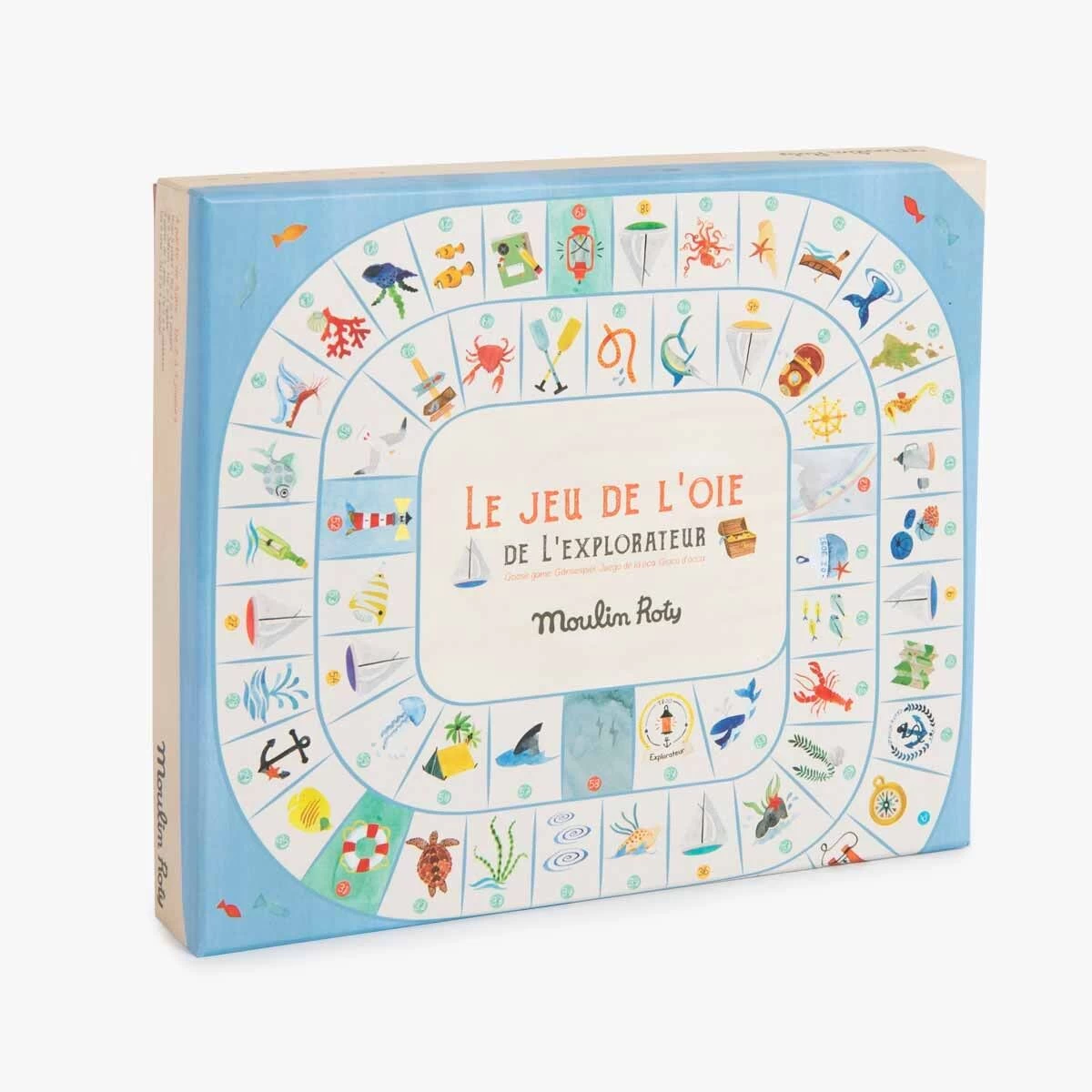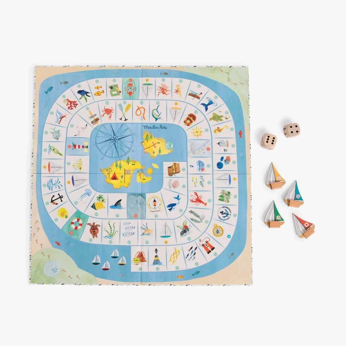 Un jeu de l’oie spécial explorateur où l’on croise de drôles de poissons et de dangereux tourbillons… Hissez les voiles, le premier arrivé sur l’île gagne le trésor ! Comprend 4 pions bateaux, 2 grands dés et un plateau illustré à l’aquarelle.