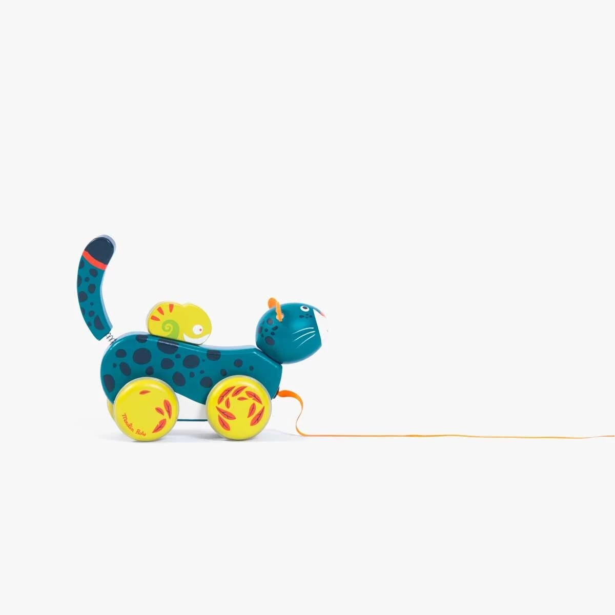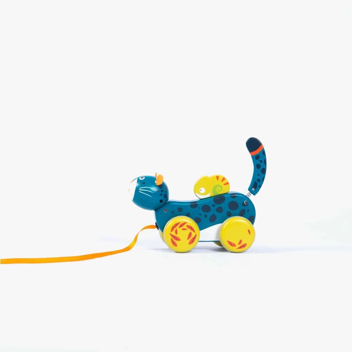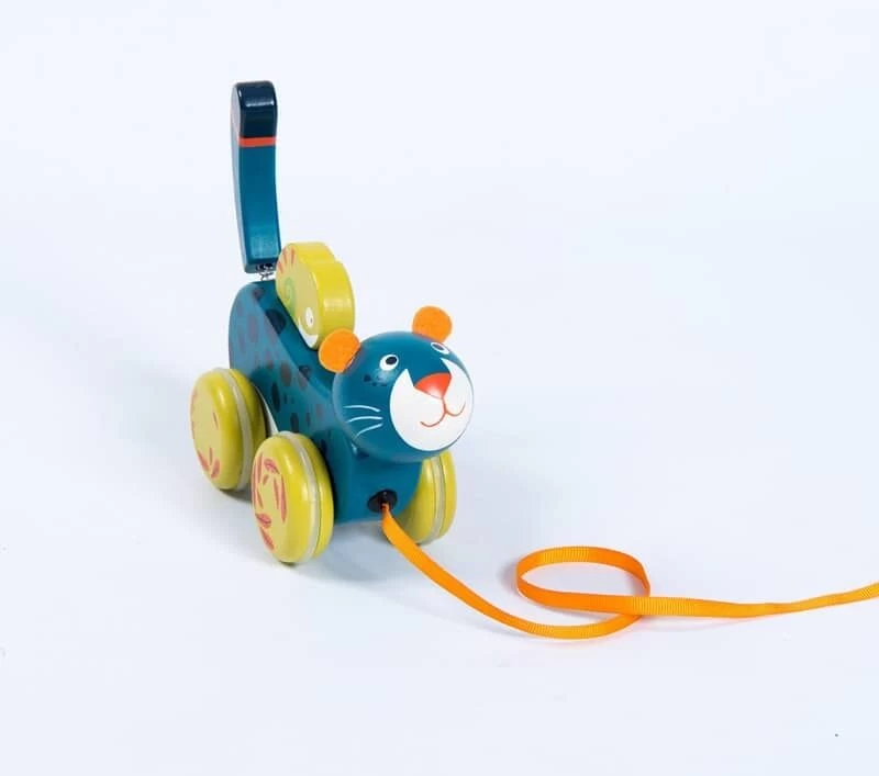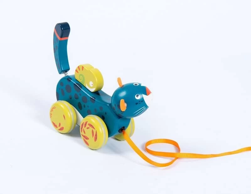 Panthère à tirer en bois, imprimée de motifs de la jungle. Elle repose sur 4 roues désaxées reproduisant le mouvement de ses foulées, et sa queue tenue par un ressort, se met à bouger ! L’enfant jouera aussi avec son ami caméléon tenu par un élastique.