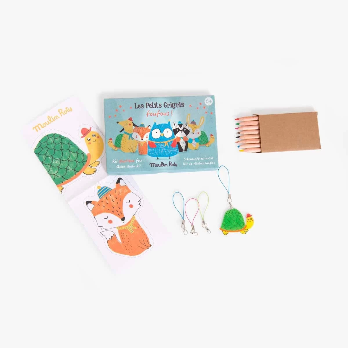 Kit plastique fou pour réaliser tes petits gris-gris ! Décalque ton dessin sur une feuille de plastique fou avec les crayons de couleurs, découpe-le et fais-le chauffer au four. C’est magique, il se contracte ! Activité manuelle à réaliser avec un adulte.