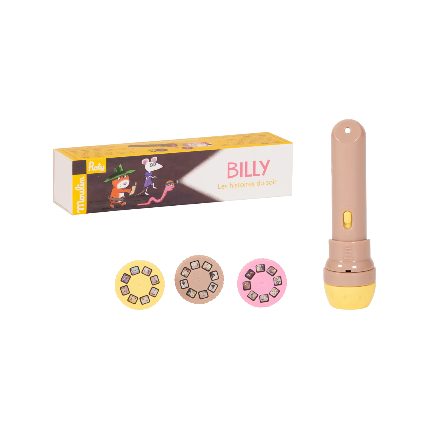 Lampe torche de poche où chacun des 3 disques projetés sur le mur raconte les aventures de Billy, le hamster cow- boy, héros de l’école des loisirs. Pour endormir les tout-petits et développer leur imagination !