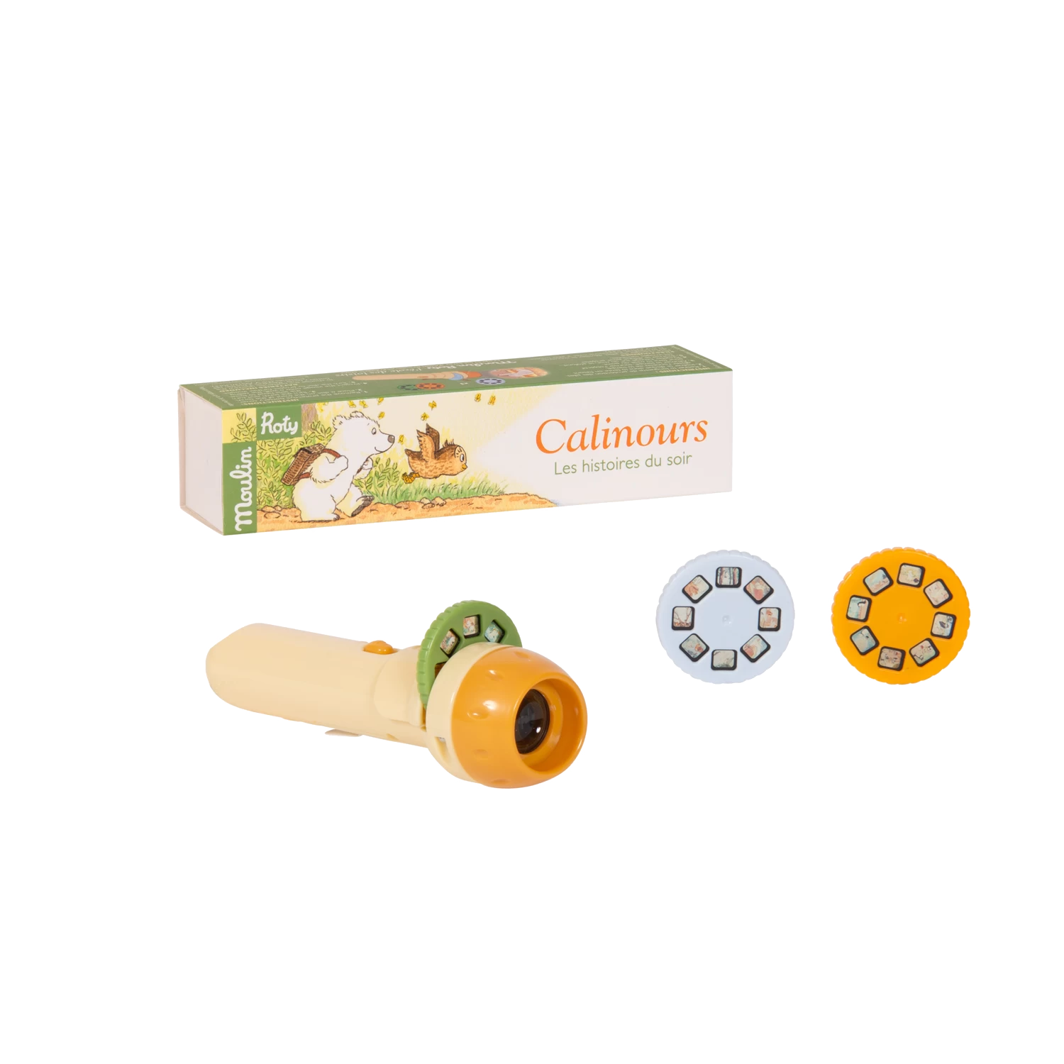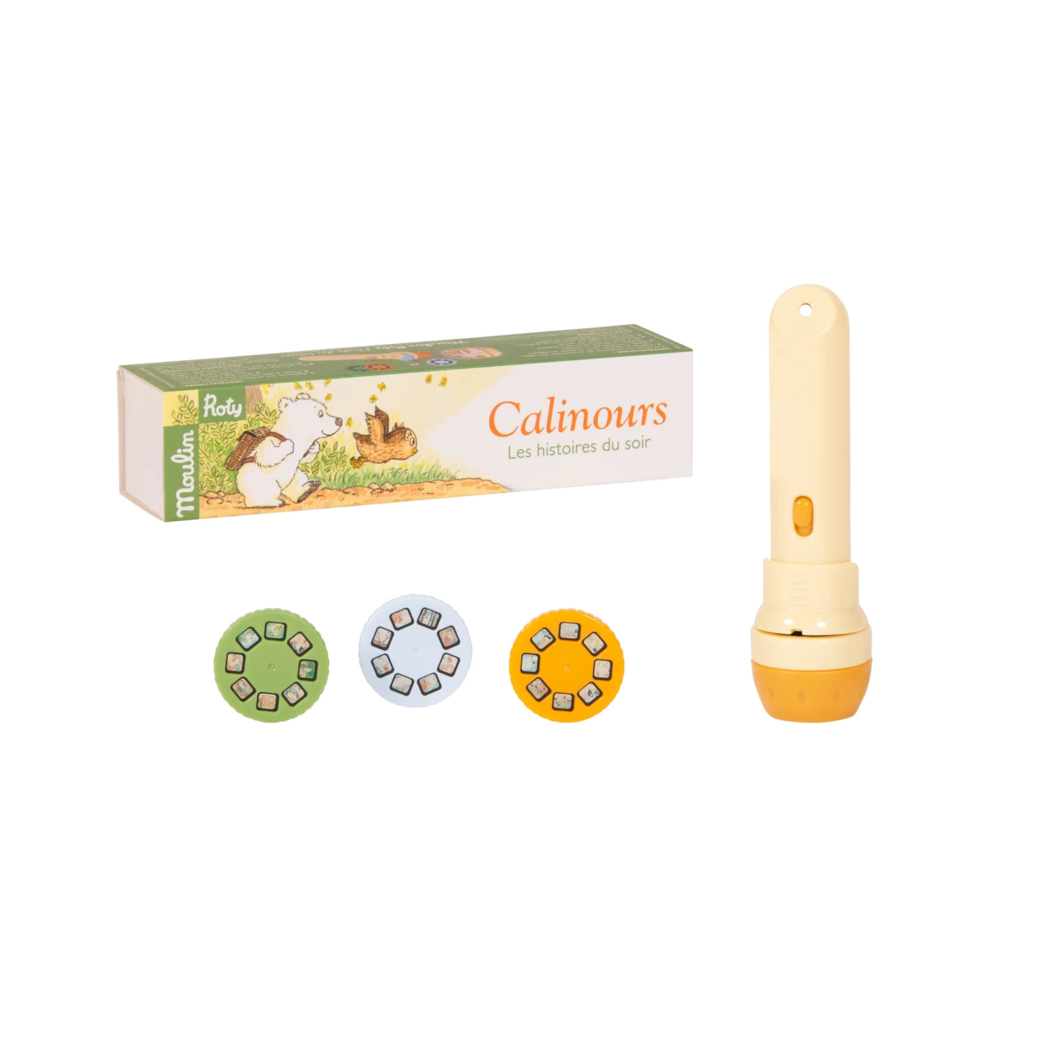 Lampe torche de poche où chacun des 3 disques projetés sur le mur raconte les aventures de Calinours, l’ourson mignon, héros de l’école des loisirs. Pour endormir les tout-petits et développer leur imagination !