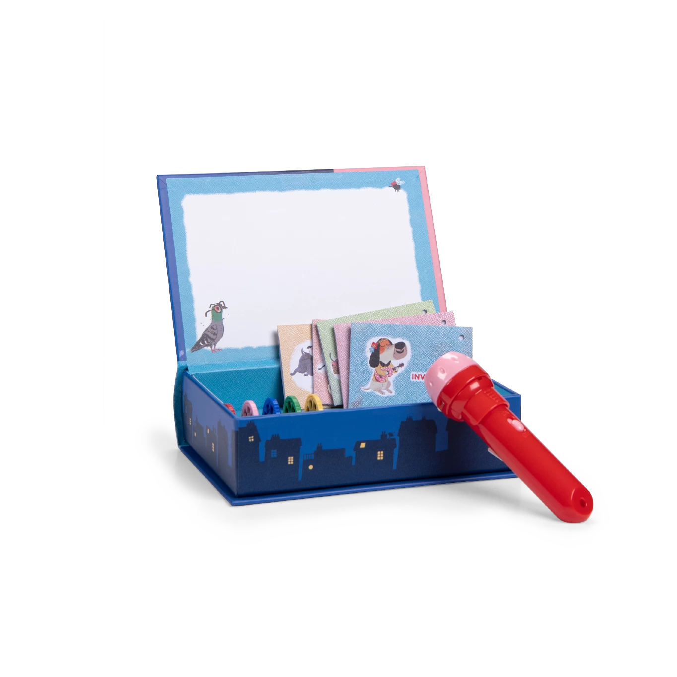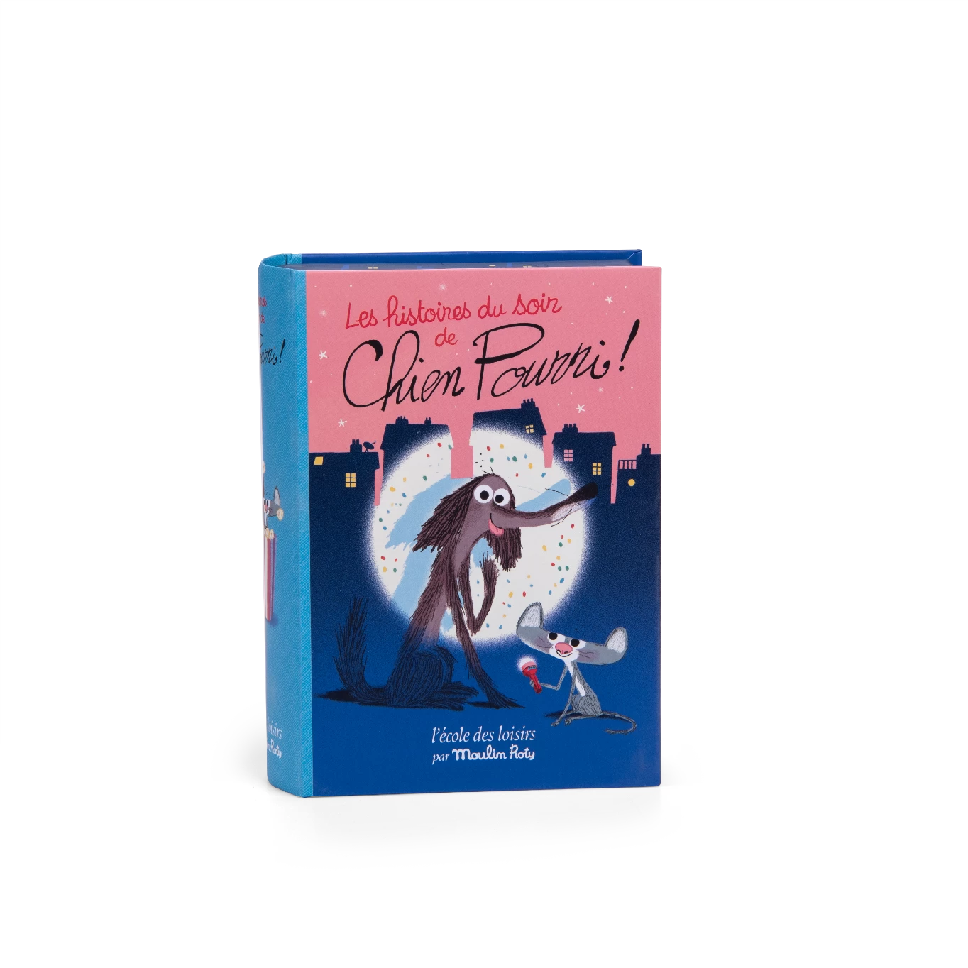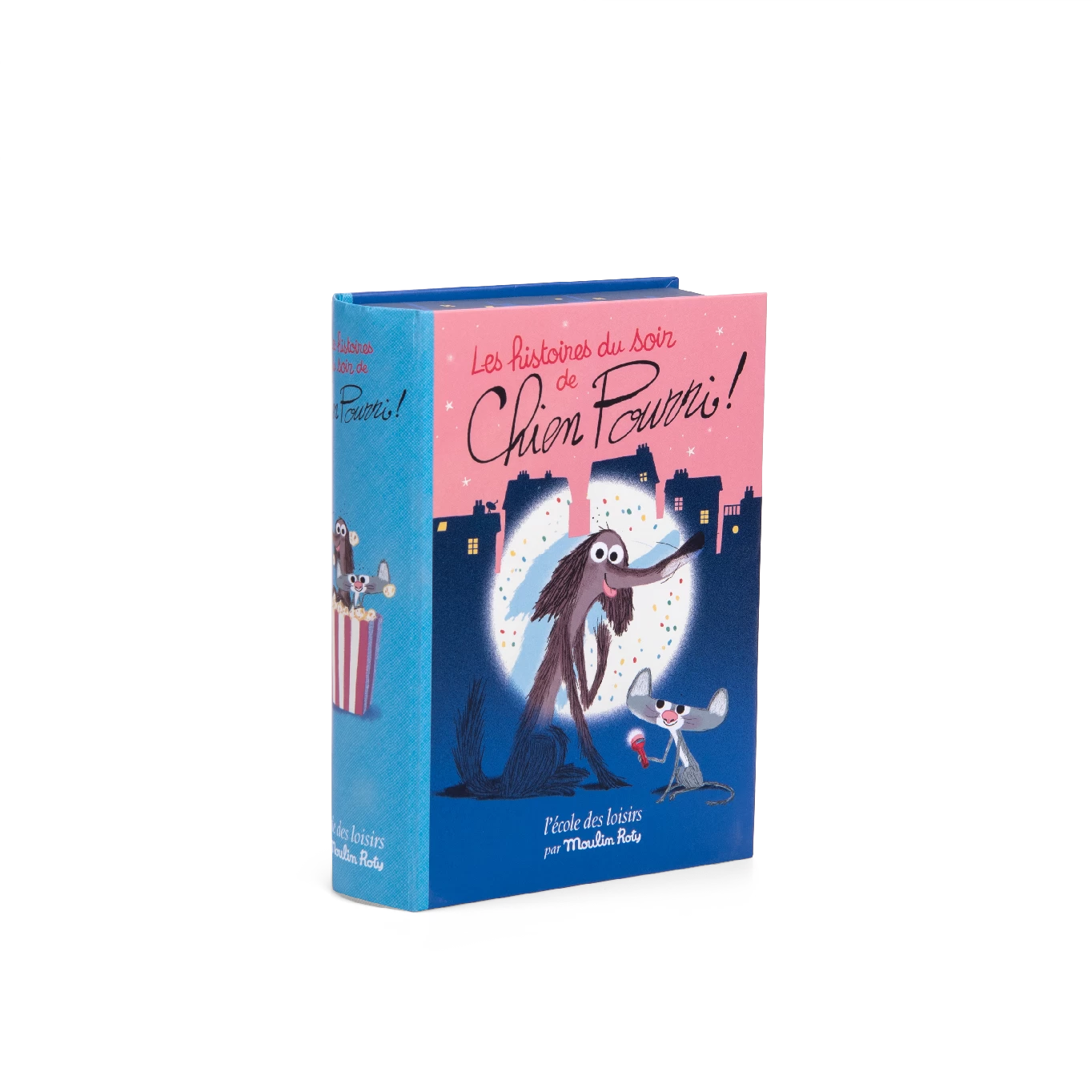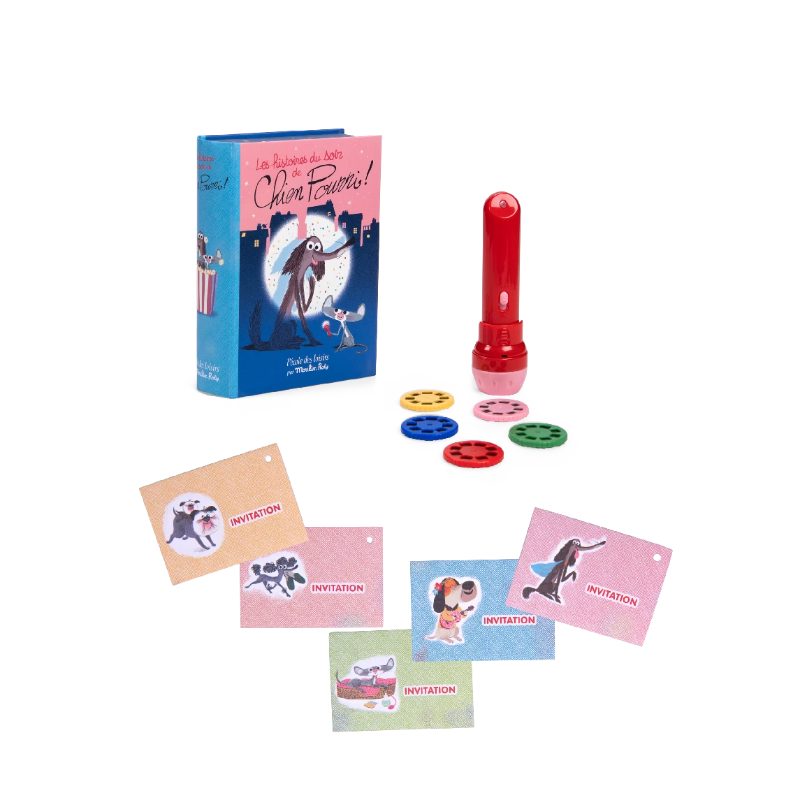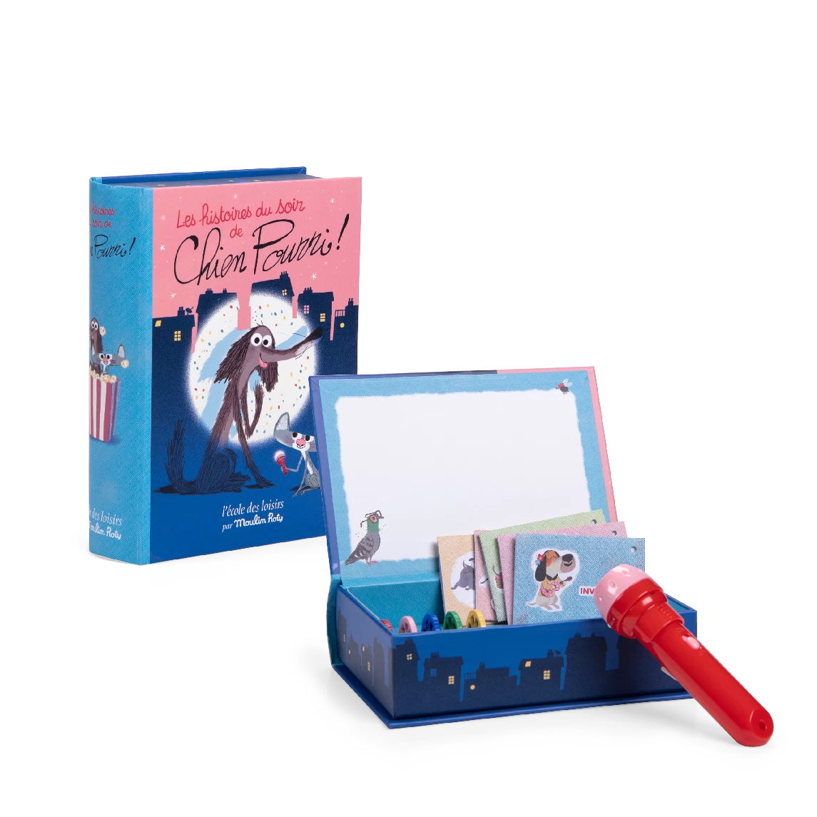 Coffret illustré, conçu comme un livre magique avec une lampe à projeter, 5 disques et 5 invitations. Chaque disque, projeté dans le livre ou sur un mur, raconte une histoire de Chien Pourri, grand farceur de l’école des loisirs.