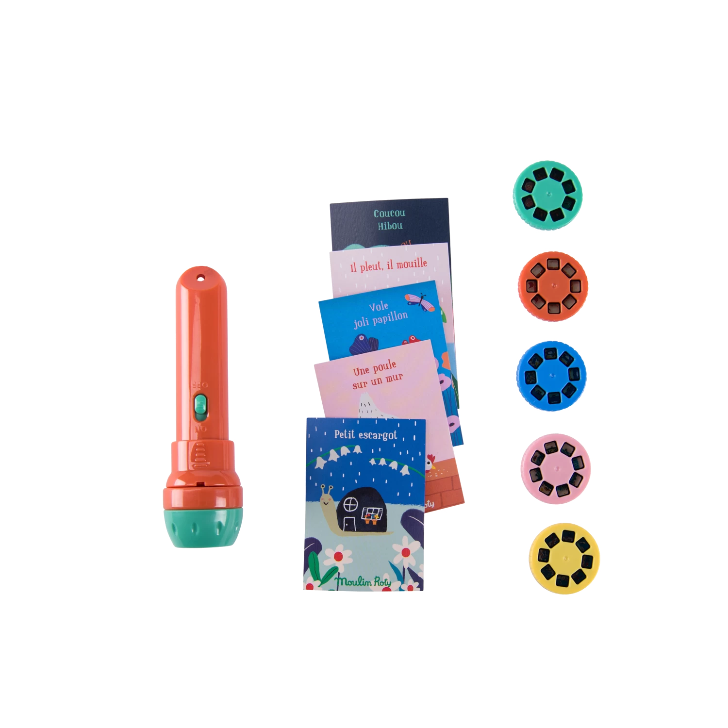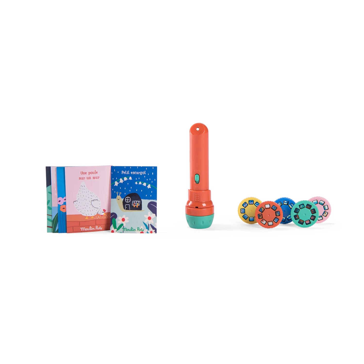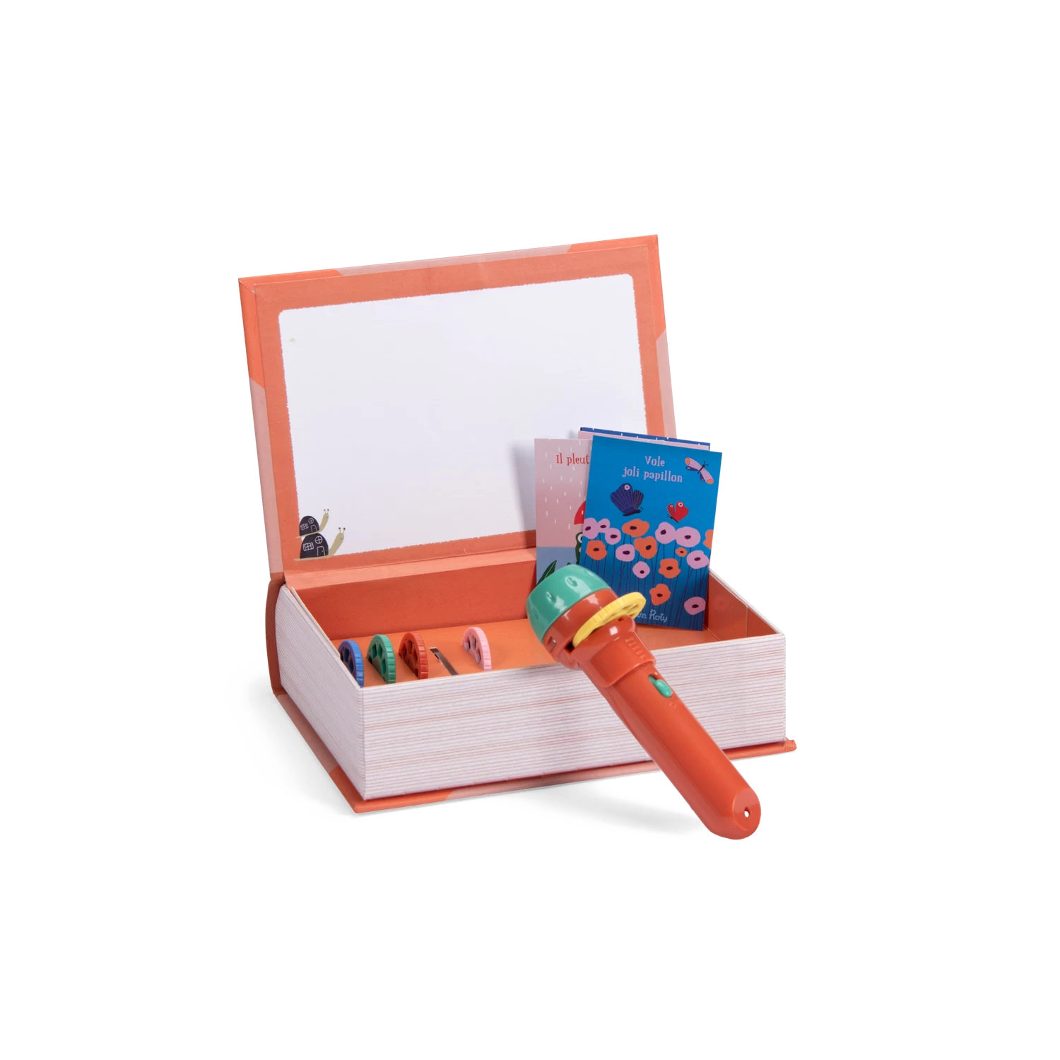 Coffret avec écran de projection, joliment illustré ! Conçu comme un livre, contient une lampe à projeter, 5 disques sur l’univers des comptines et 5 cartes pour chantonner. Développe l’imaginaire des petits et offre de précieux moments de complicité.