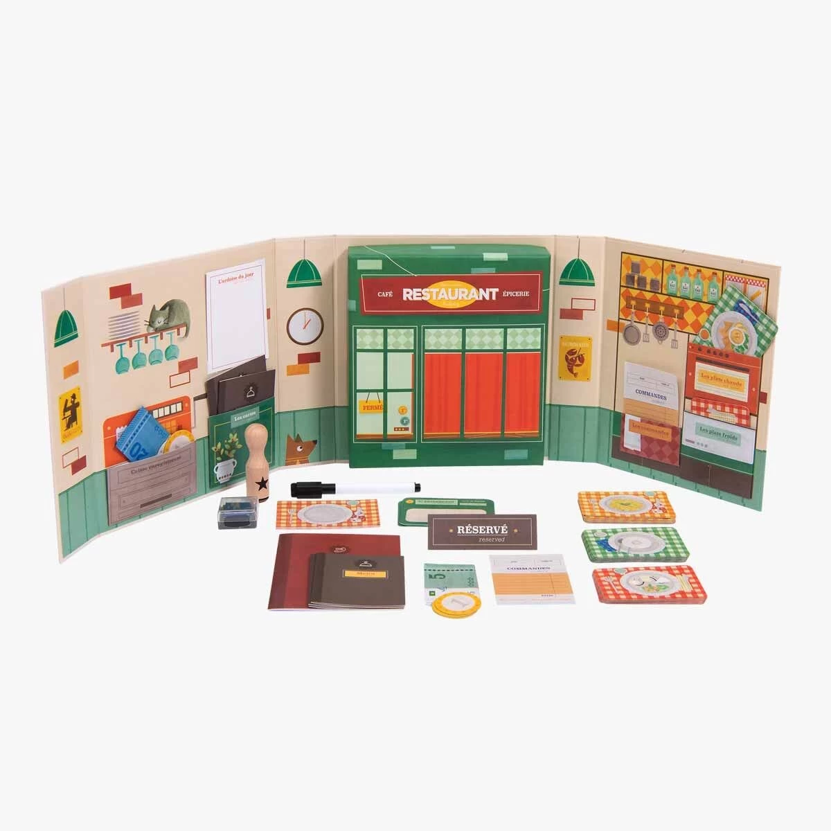 Coffret en carton “Le Restaurant” avec 2 volets à déployer. Une fois installé, la journée commence : menus, bloc-notes, addition… ainsi qu’un tampon et un crayon effaçable pour l’ardoise du jour ! Tout le nécessaire pour jouer et imaginer son quotidien !
