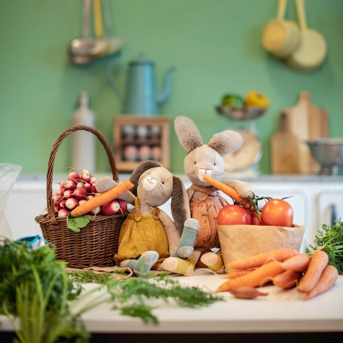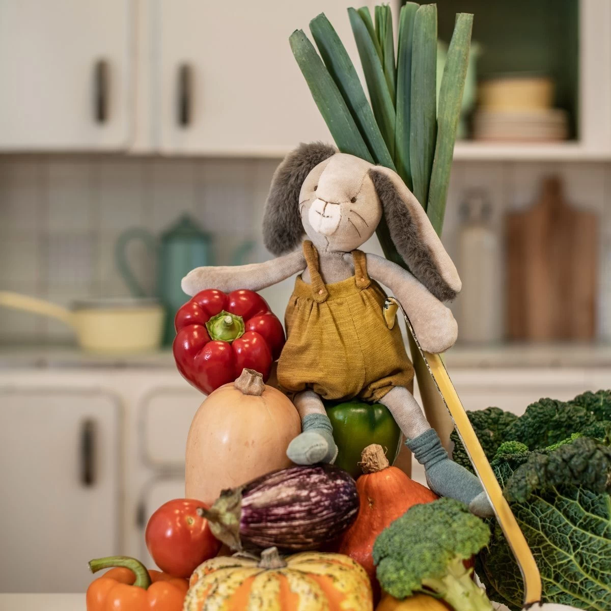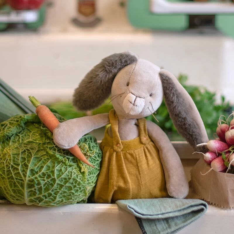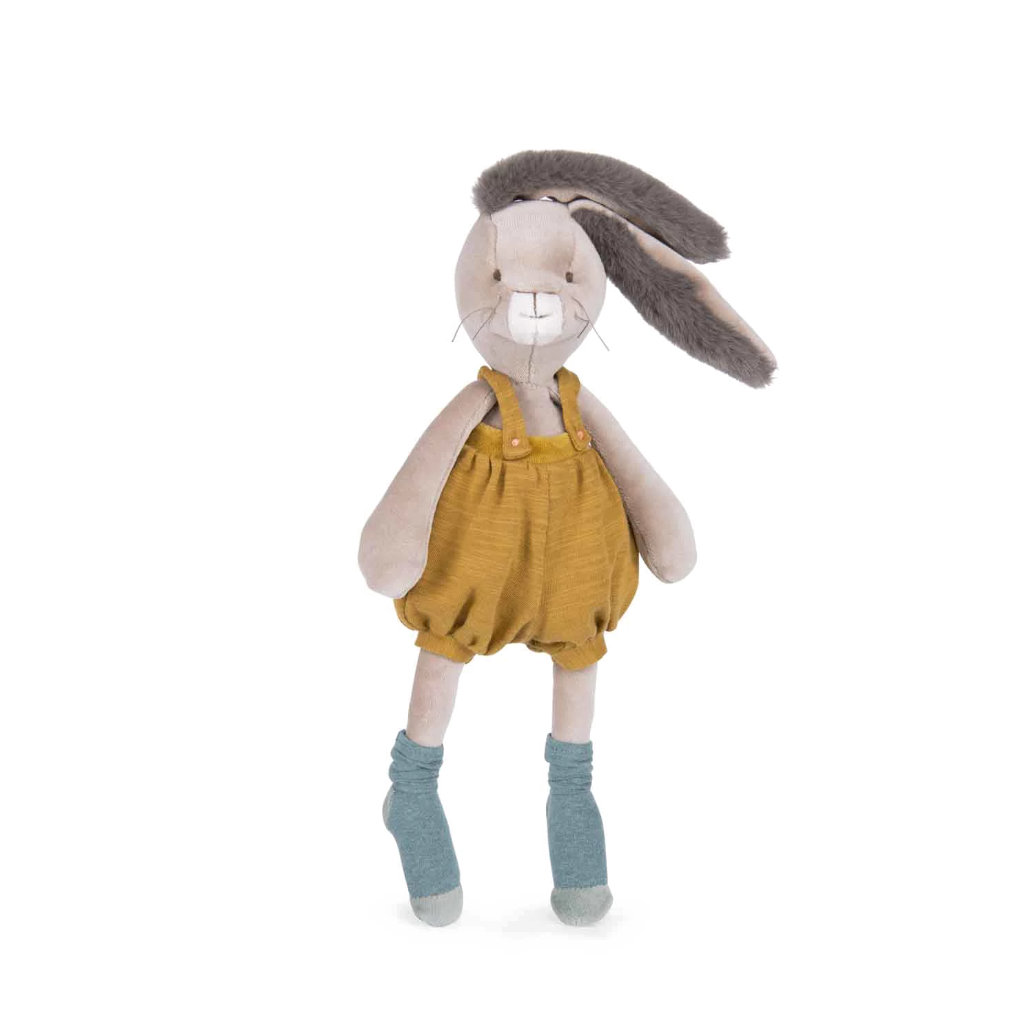 Avec sa frimousse à moustaches et ses grandes oreilles toutes douces, cet adorable lapin à la salopette ocre ne demande qu’à faire des câlins ! Compagnon de jeu la journée et doudou protecteur la nuit, il accompagnera bébé.