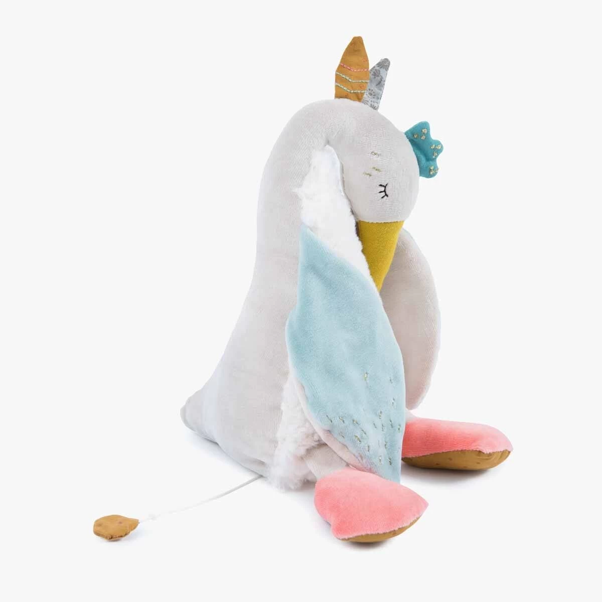 Poupée musicale avec une languette qui se trouve sous l’oie Olga et son pelage en éponge velours gris et fourrure crème, laissez bébé s’apaiser et s’endormir sur la douce mélodie…