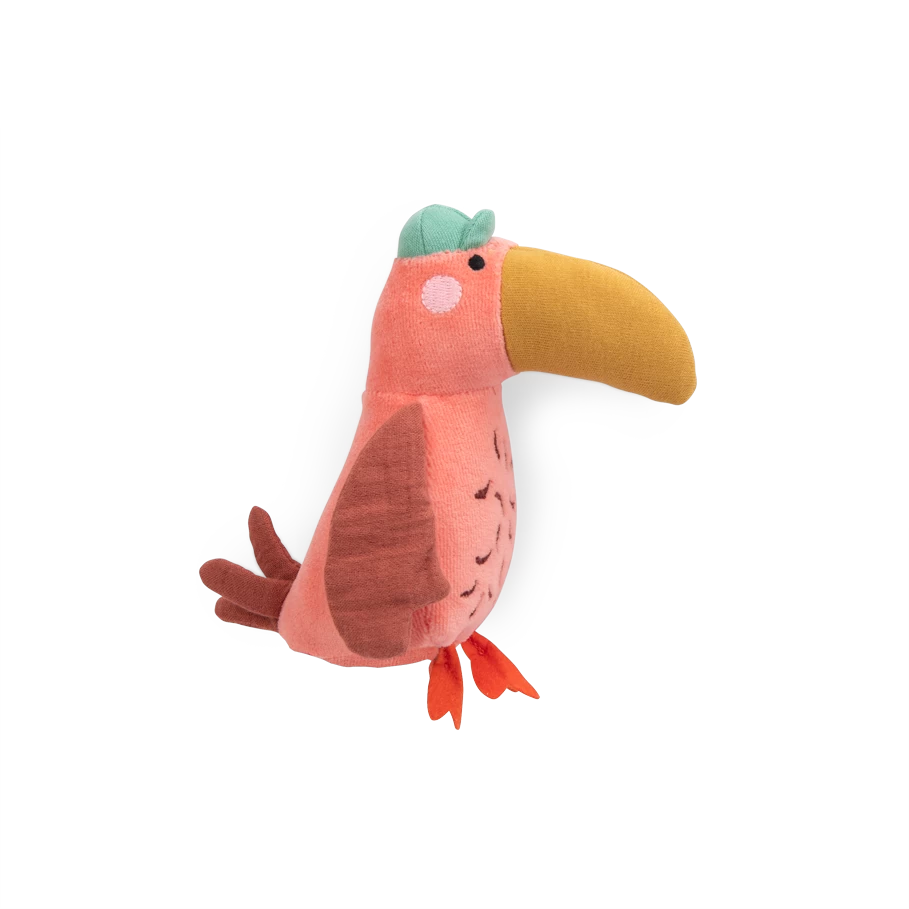 Petit toucan en velours tout doux à la belle couleur orangée. Casquette sur la tête et gros bec, il fera craquer à coup sûr bébé. Dans son ventre se cachent de petites billes qui font du bruit quand on l’agite.