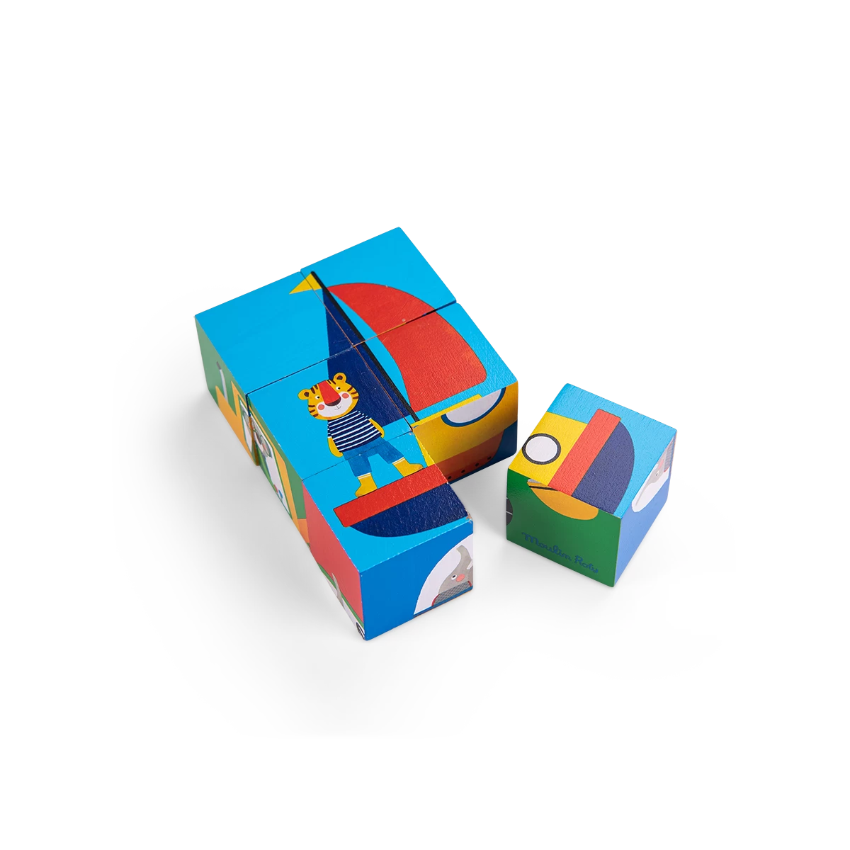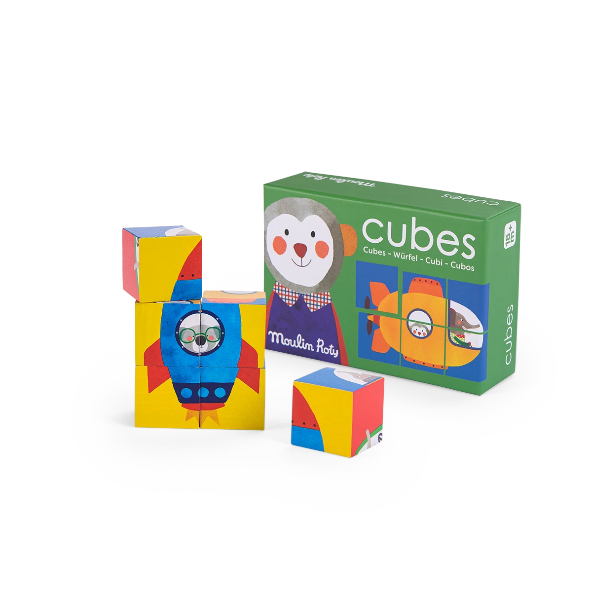 Jeu d’éveil 2 en 1 pour les tout-petits. à la fois puzzle et jeu de construction. Tourne les faces illustrées des 6 cubes pour reconstituer Les Popipop dans leur moyen de locomotion préféré. Cubes en bois facile à manier. Dès18 mois