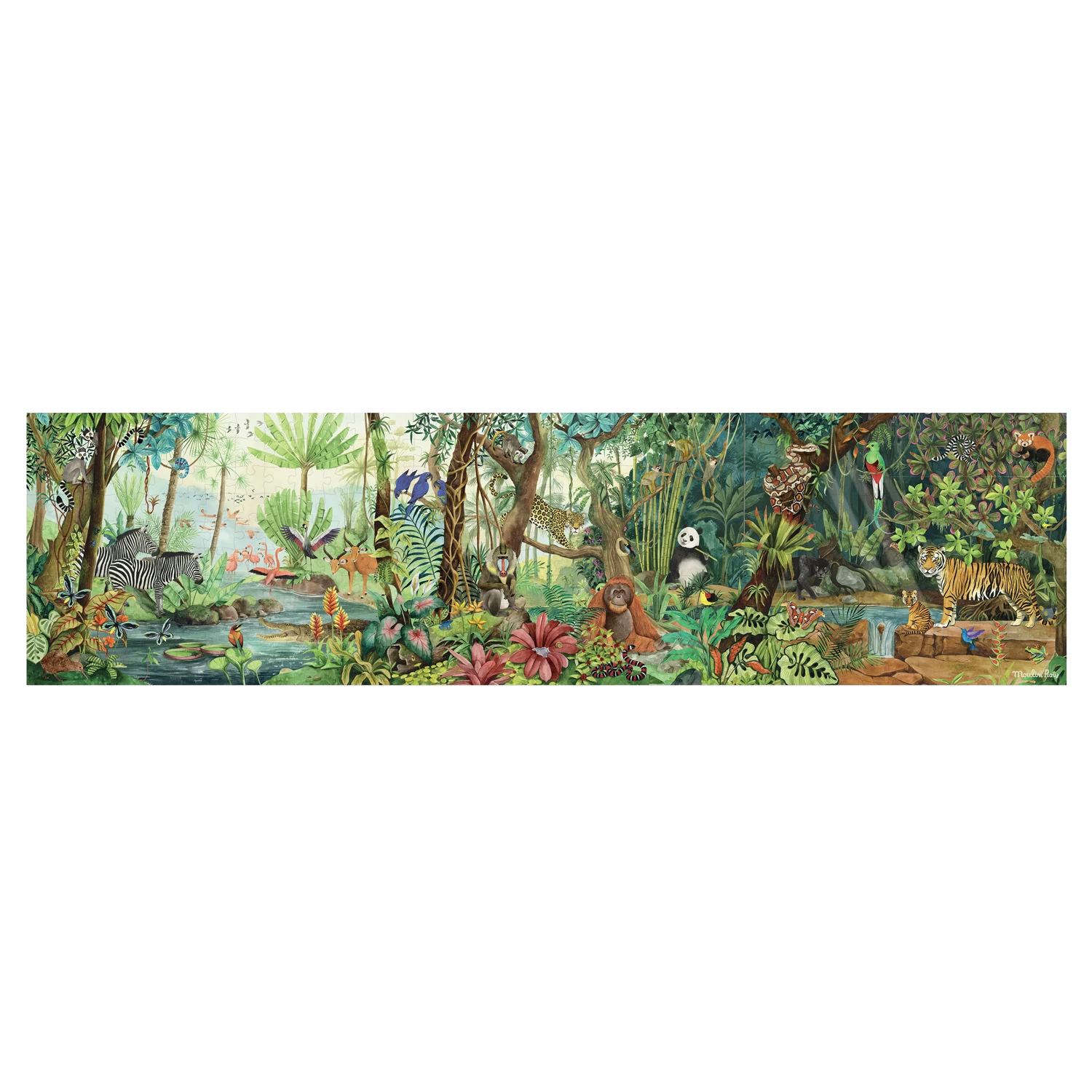 Puzzle panoramique 350 pcs Dans la forêt tropicale + 1 poster modèle. Découvre l’habitat de 50 % des animaux et plantes du monde. Une fois assembl, teste tes capacités d’observation. Combien comptes-tu d’espèces ? Te souviens-tu de leurs noms ? 7 ans et +