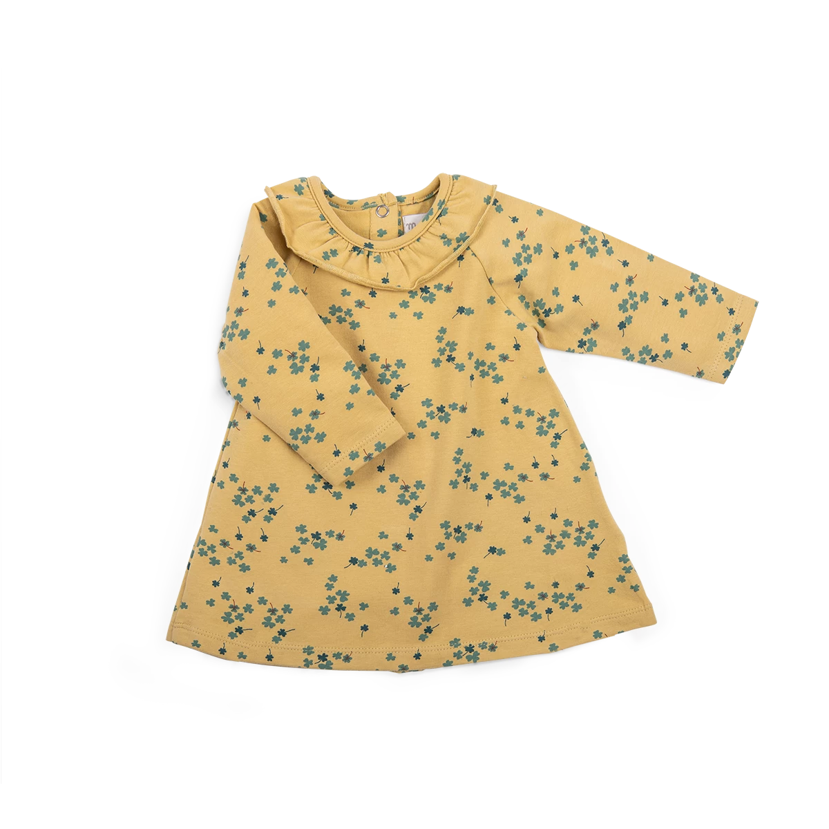 Robe confortable, en jersey de coton. Coupe évasée et col volanté, imprimée d’un charmant all-over trèfles. Finition carbone gratté pour la douceur.