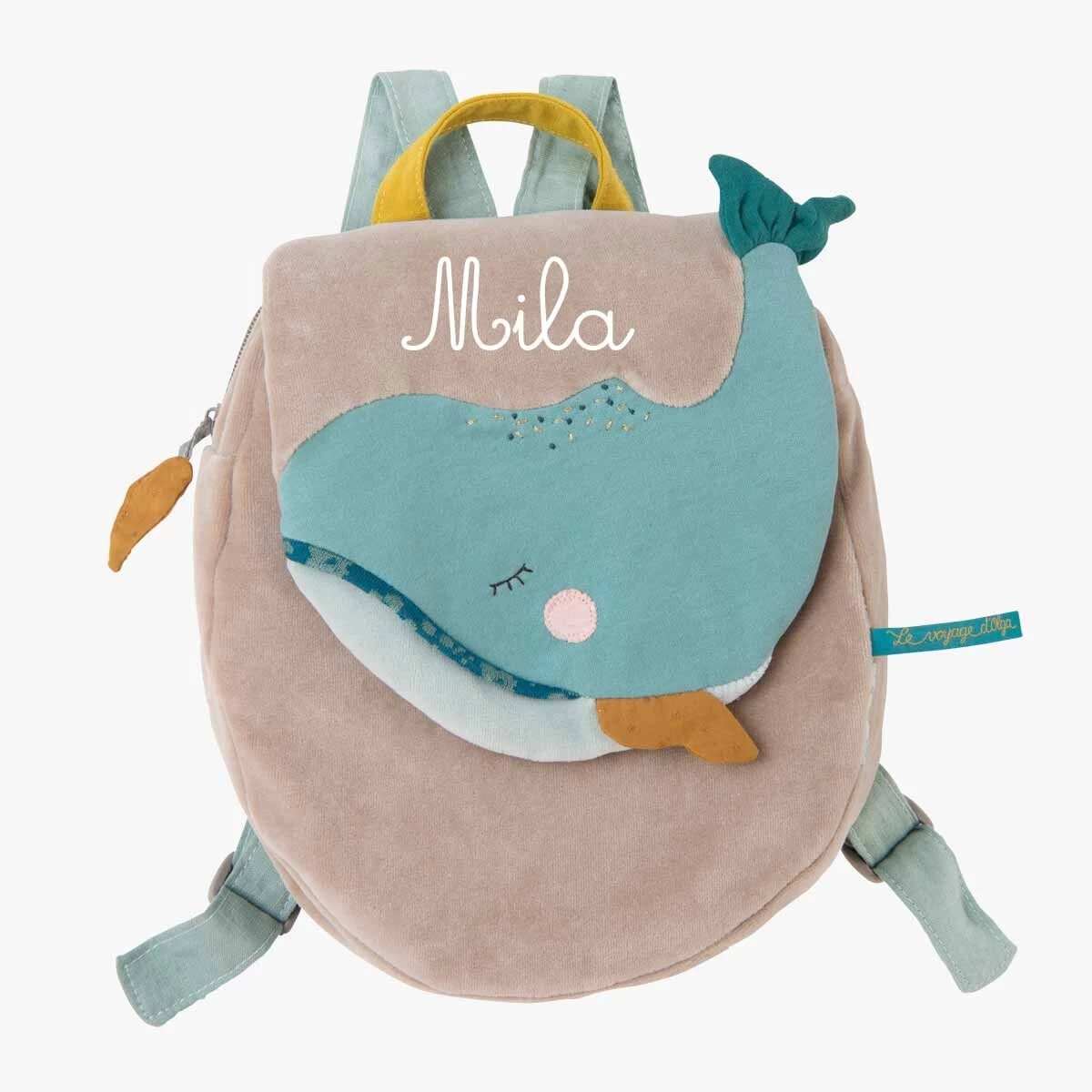 Sac à dos en velours éponge gris et bleu. Joséphine la baleine gardera les affaires des tous petits lors de leur petit ou grand voyage… Peut contenir un cahier A5. Peut être brodé au prénom de l’enfant. Idéal pour un cadeau naissance.