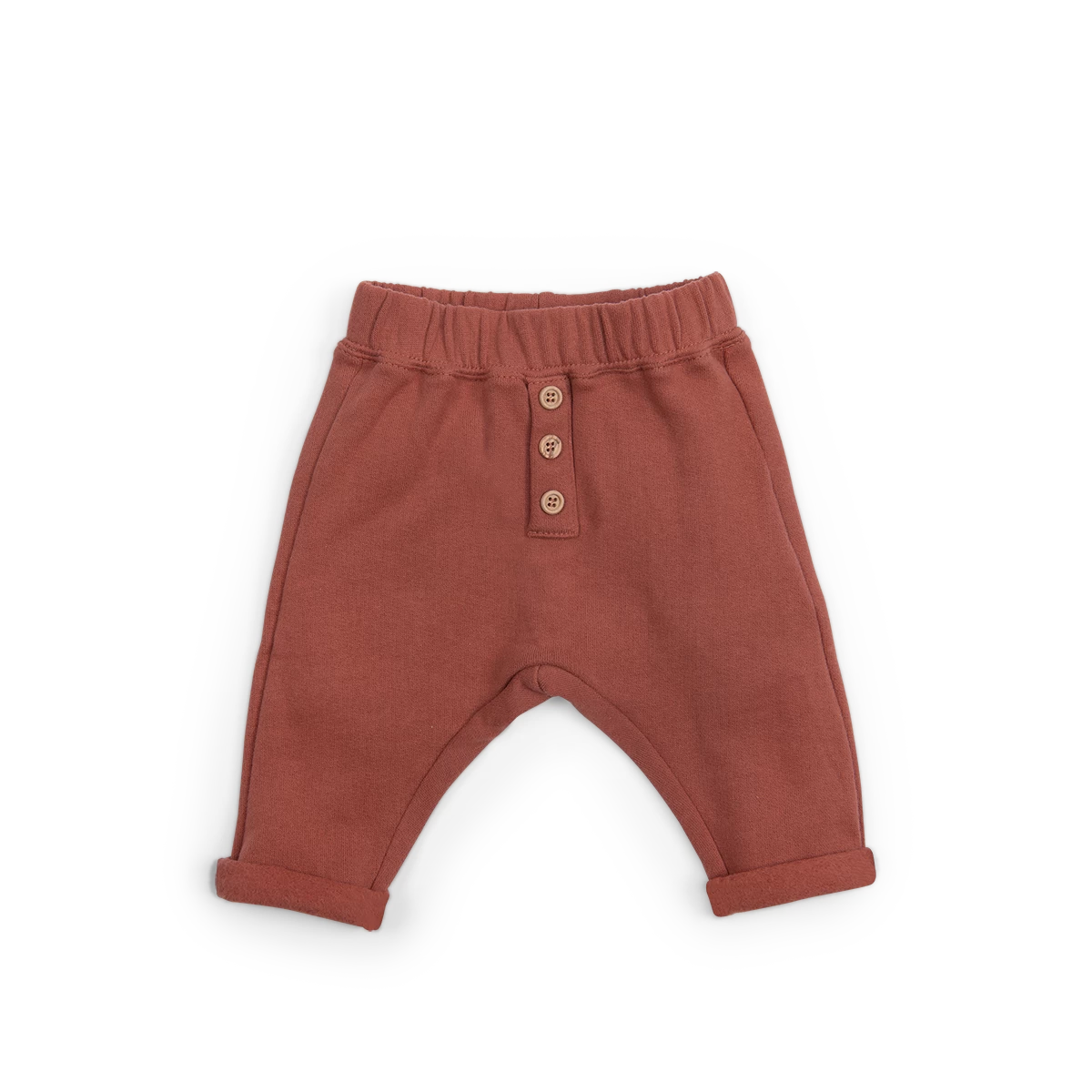 Sarouel cannelle en molleton gratté 100% coton. Boutonnière en trompe l’œil pour un look plus sophistiqué. Elastiqué à la taille.