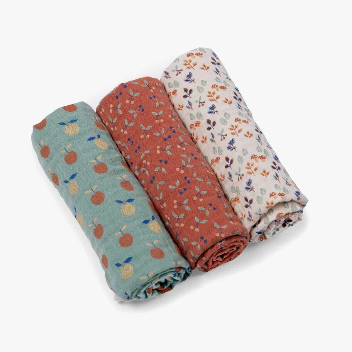 Moulin Roty Set De 3 Langes Imprimes (cerises/forêt/pommes)