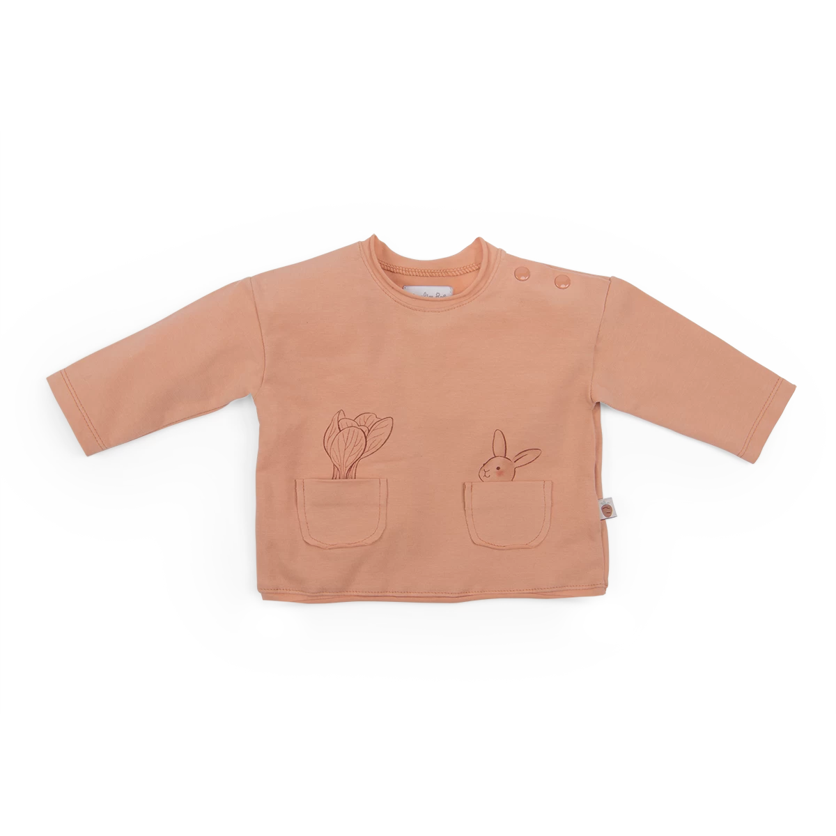 T-shirt noisette en jersey flammé. Poches plaquées avec imprimés chou et lapin. Roulotté à la taille et à l’encolure pour la finition.