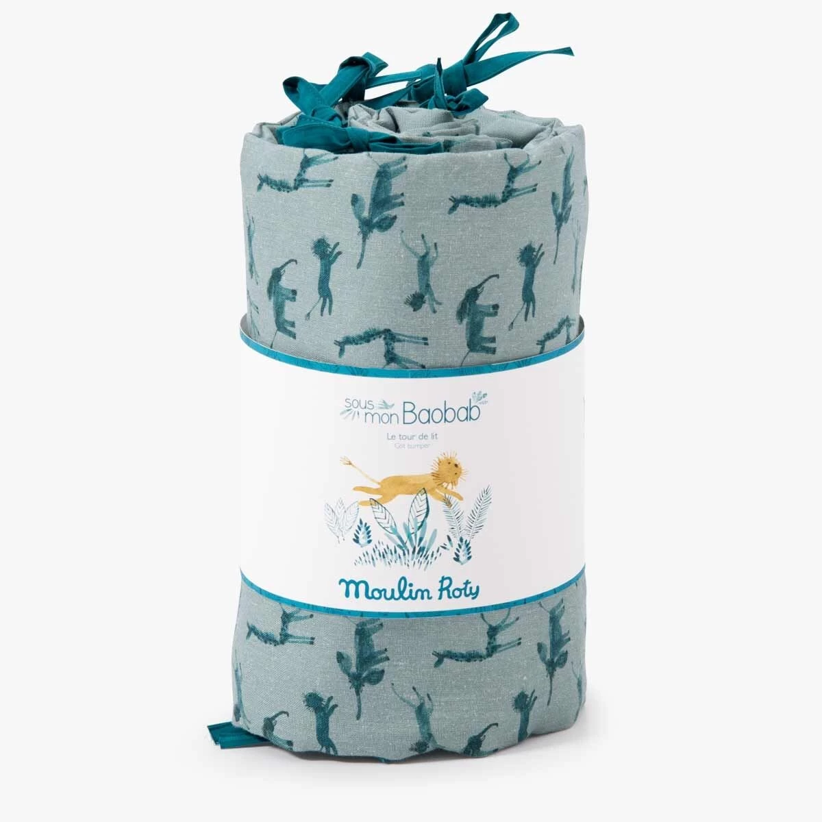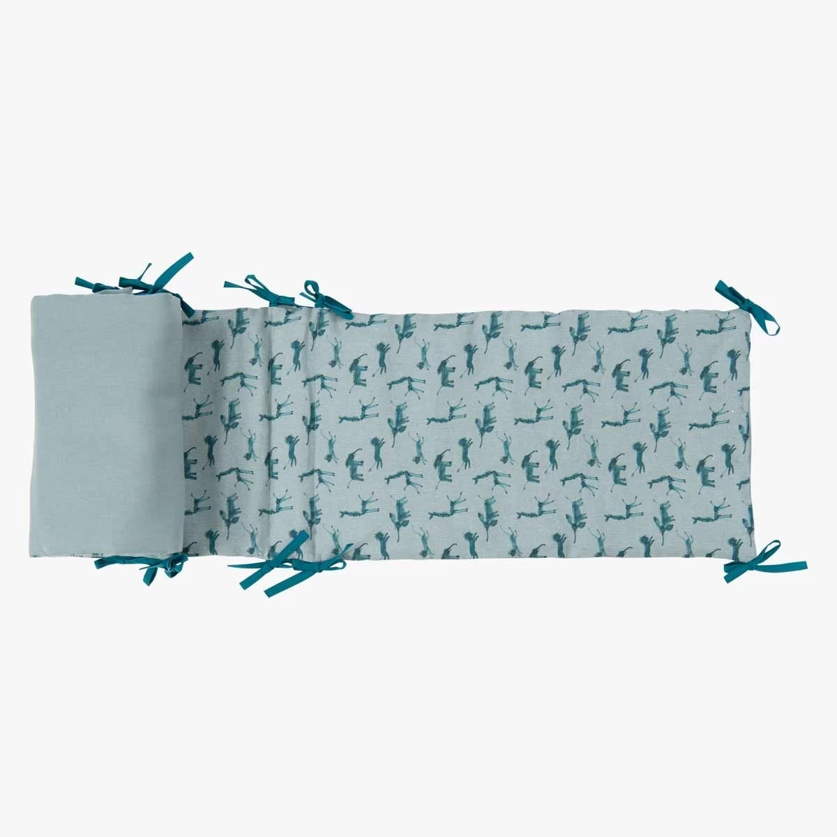 Tour de lit rembourré, en lin lavé et coton très doux. Bleu uni au dos, face imprimée avec animaux bleus. Il habille le lit pour entourer bébé de douceur et décorer sa chambre avec l’univers de la collection. Dimensions : 180x33cm.