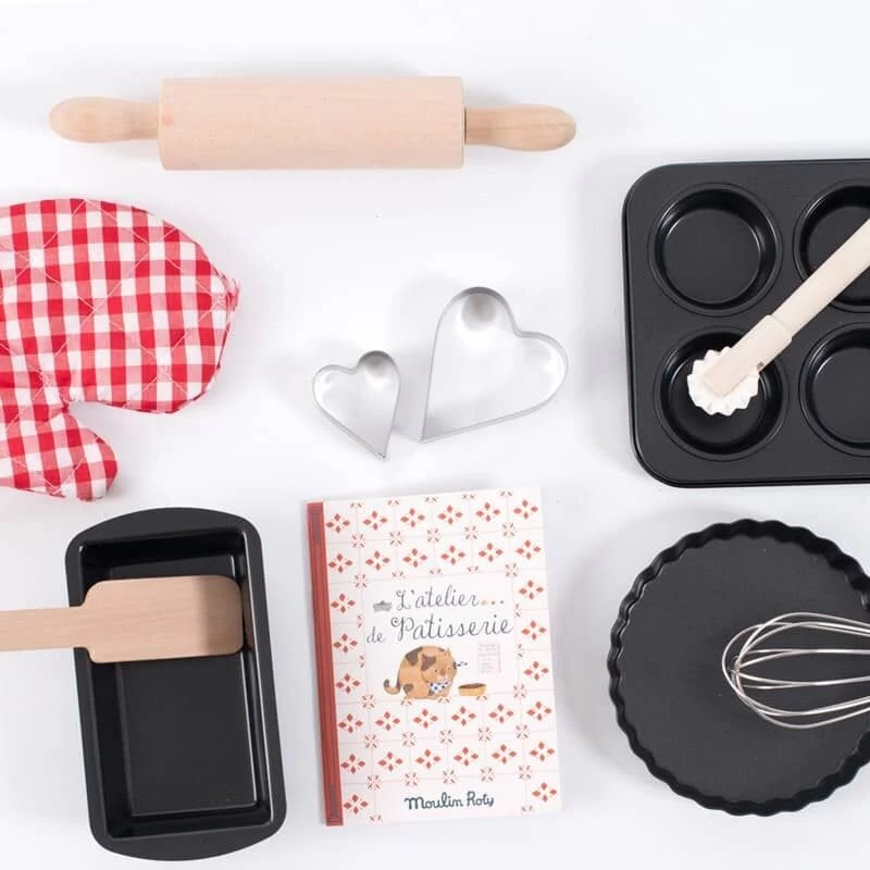 Tout l’univers de l’atelier pâtisserie contenu dans une valise !Pour faire comme les grands : de vrais ustensiles de cuisine en bois ou en métal, des moules à gâteaux, des emporte – pièces, un fouet et un recueil de 9 recettes sucrées…